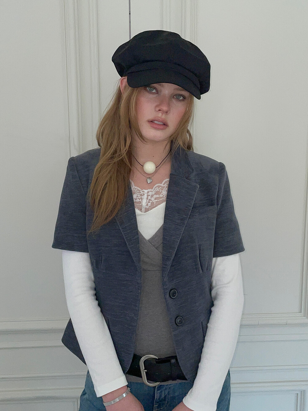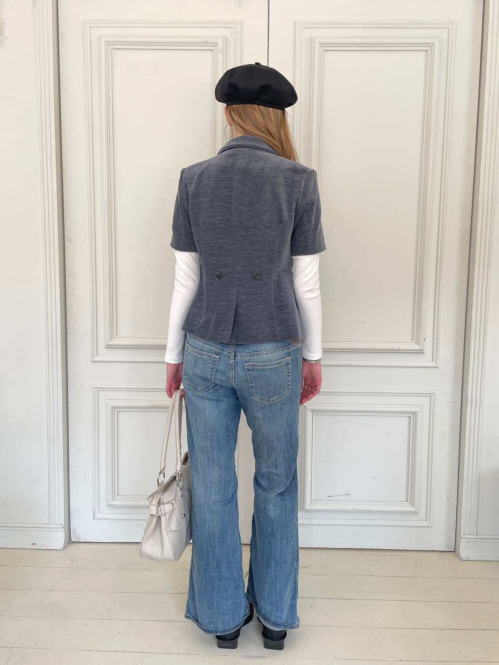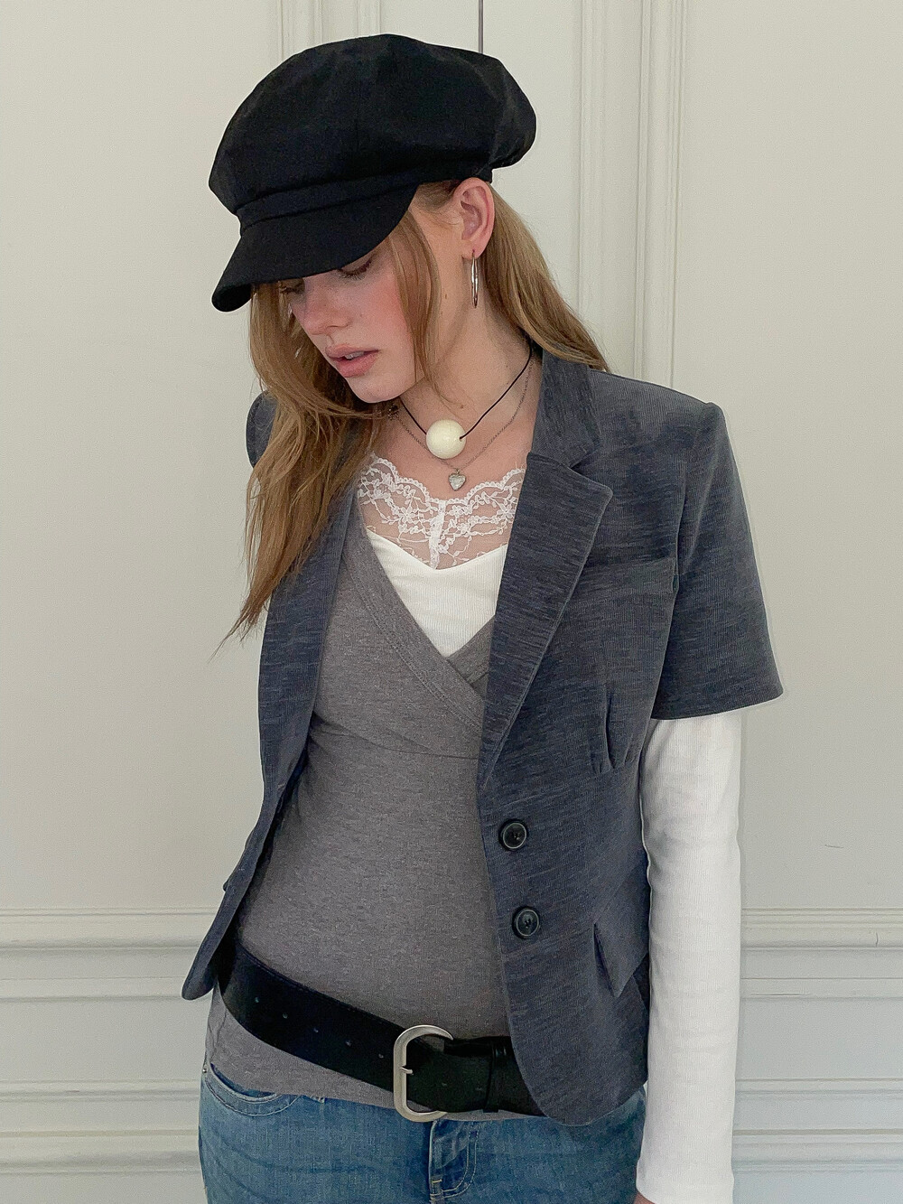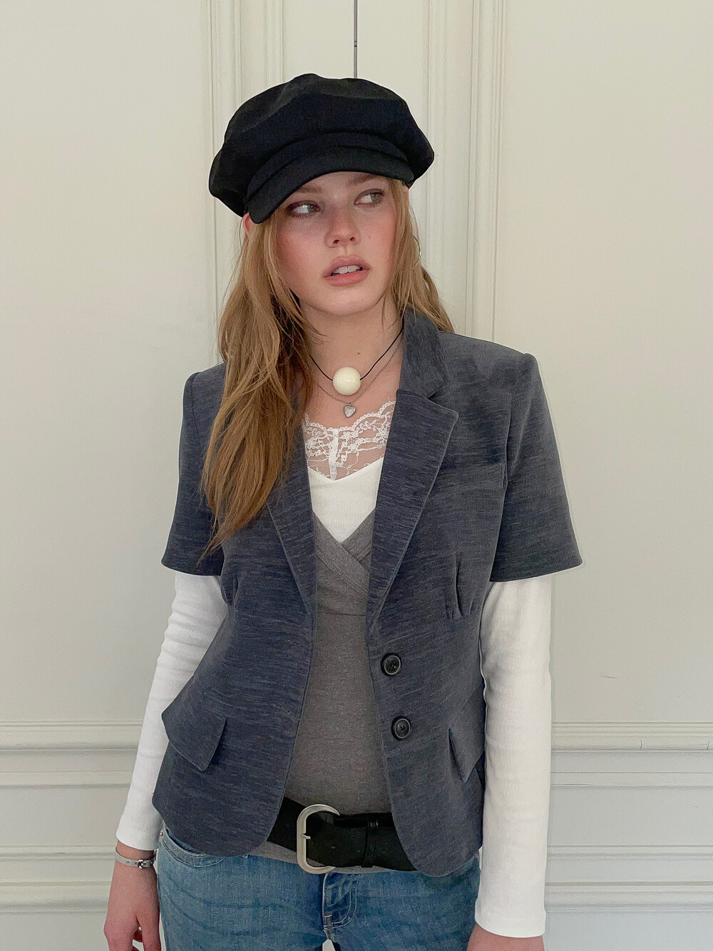 빈티지한 색감과 구조적인 실루엣이 돋보이는 반팔 자켓입니다. 탄탄하고 두께감 있는 소재를 사용하여 형태를 유지하며 가슴 밑단의 셔링 디테일이 입체감 있는 볼륨을 만들어내어 더욱 페미닌하고 감각적인 실루엣을 완성합니다. 특히 허리 부분의 패널 디테일은 빈티지한 감성을 더함과 동시에 바디 라인을 슬림하게 잡아주는 역할을 합니다. 반팔 기장으로 셔츠나 슬리브리스 등 다양한 아이템과 함께 레이어드가 가능한 아이템입니다.