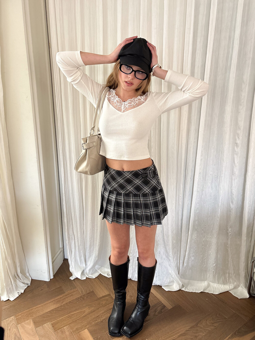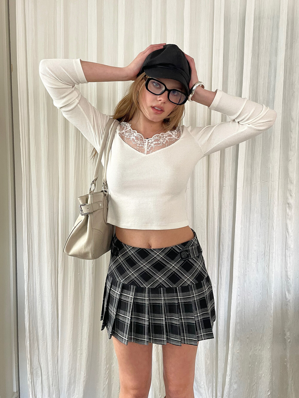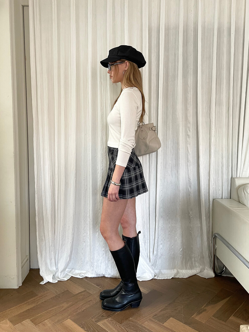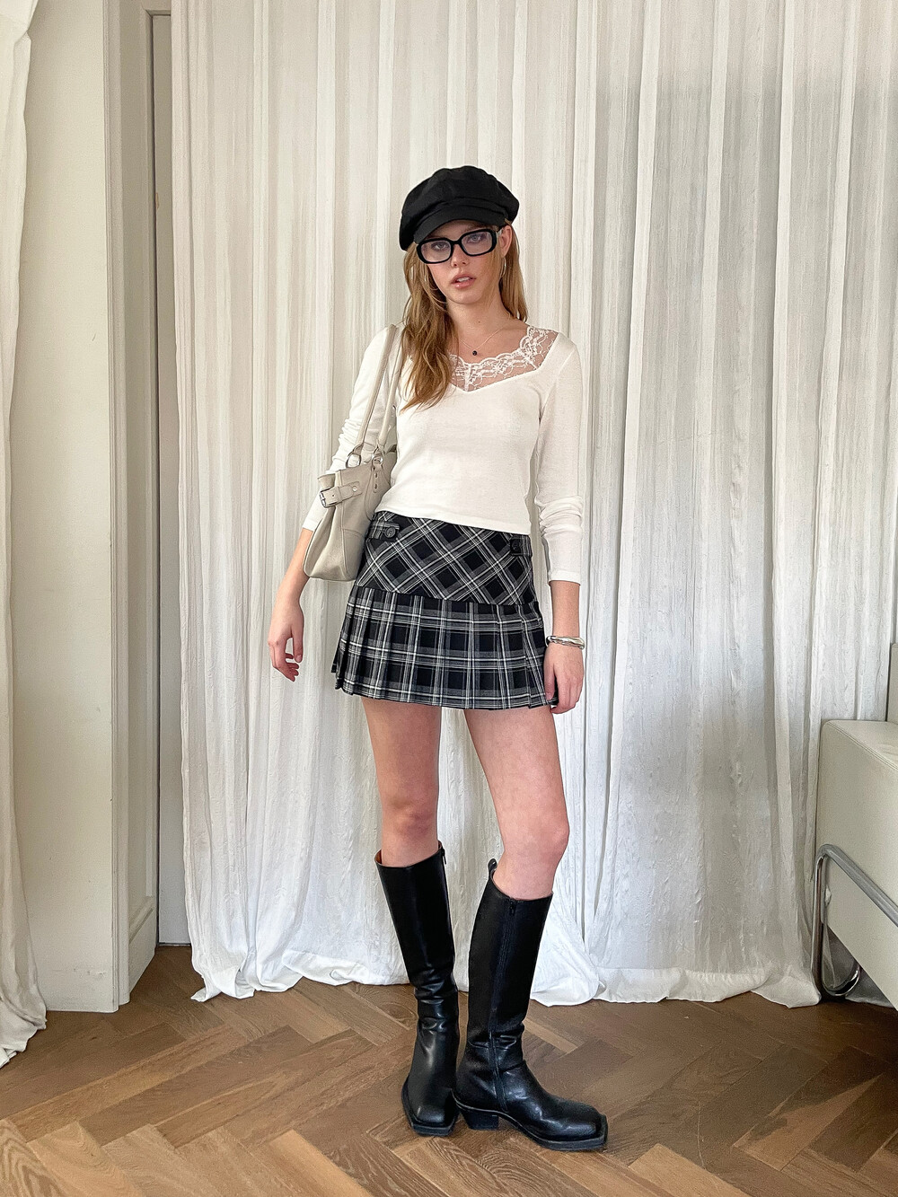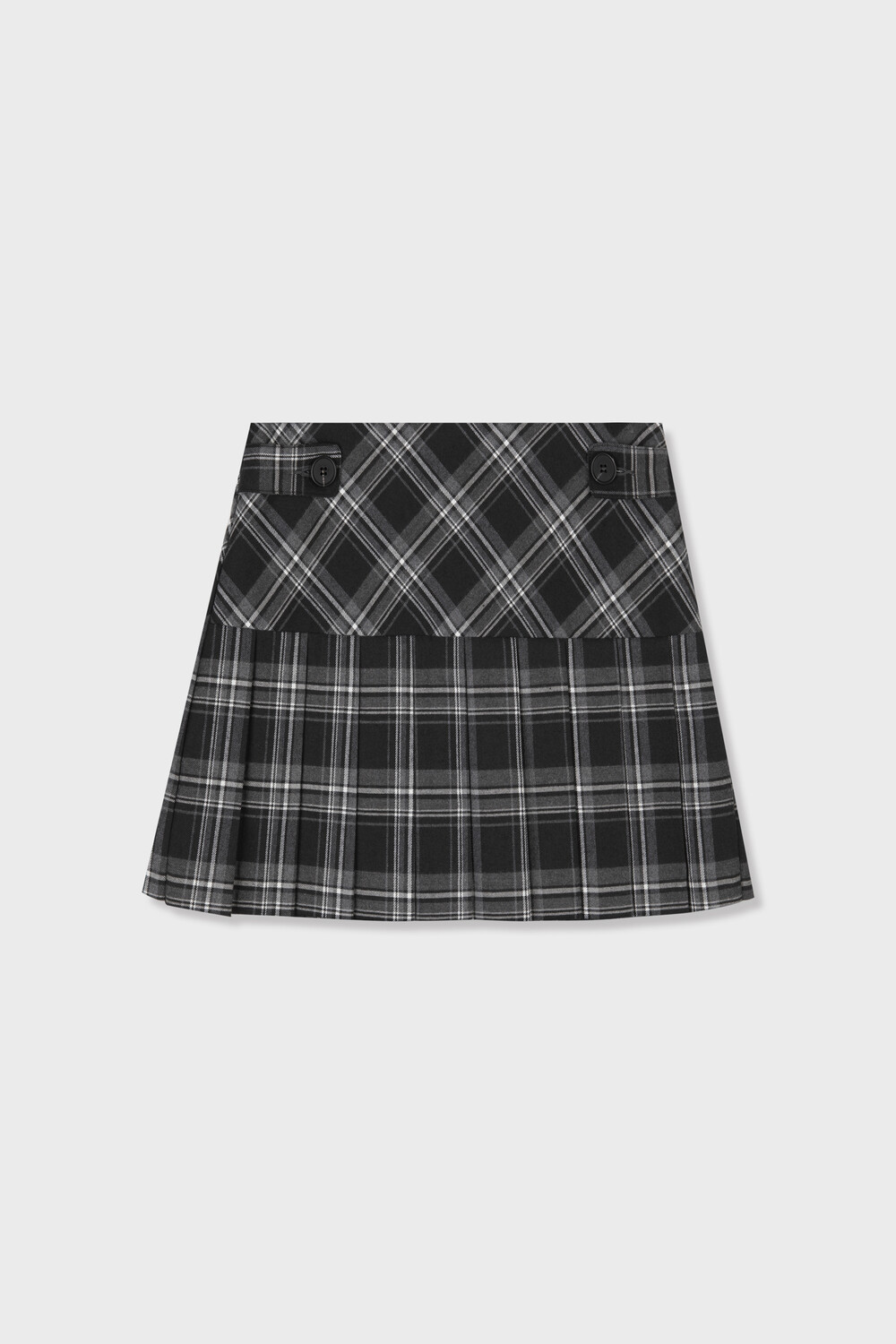 클래식한 블랙&화이트 체크 원단을 사용하여 입체적인 구조를 살린 미니 스커트입니다. 허리 양 사이드에는 비조 디테일을 더해 실루엣 조절과 동시에 포인트 요소를 주었으며 탄탄한 원단감이 플리츠 라인을 안정적으로 잡아주어 단독 착용만으로도 감각적인 룩을 완성하는 아이템입니다.