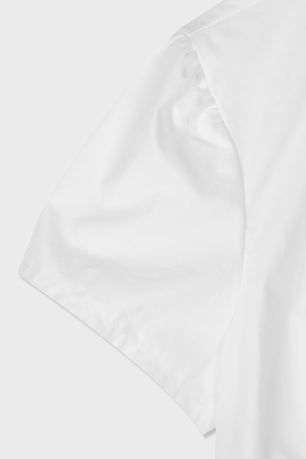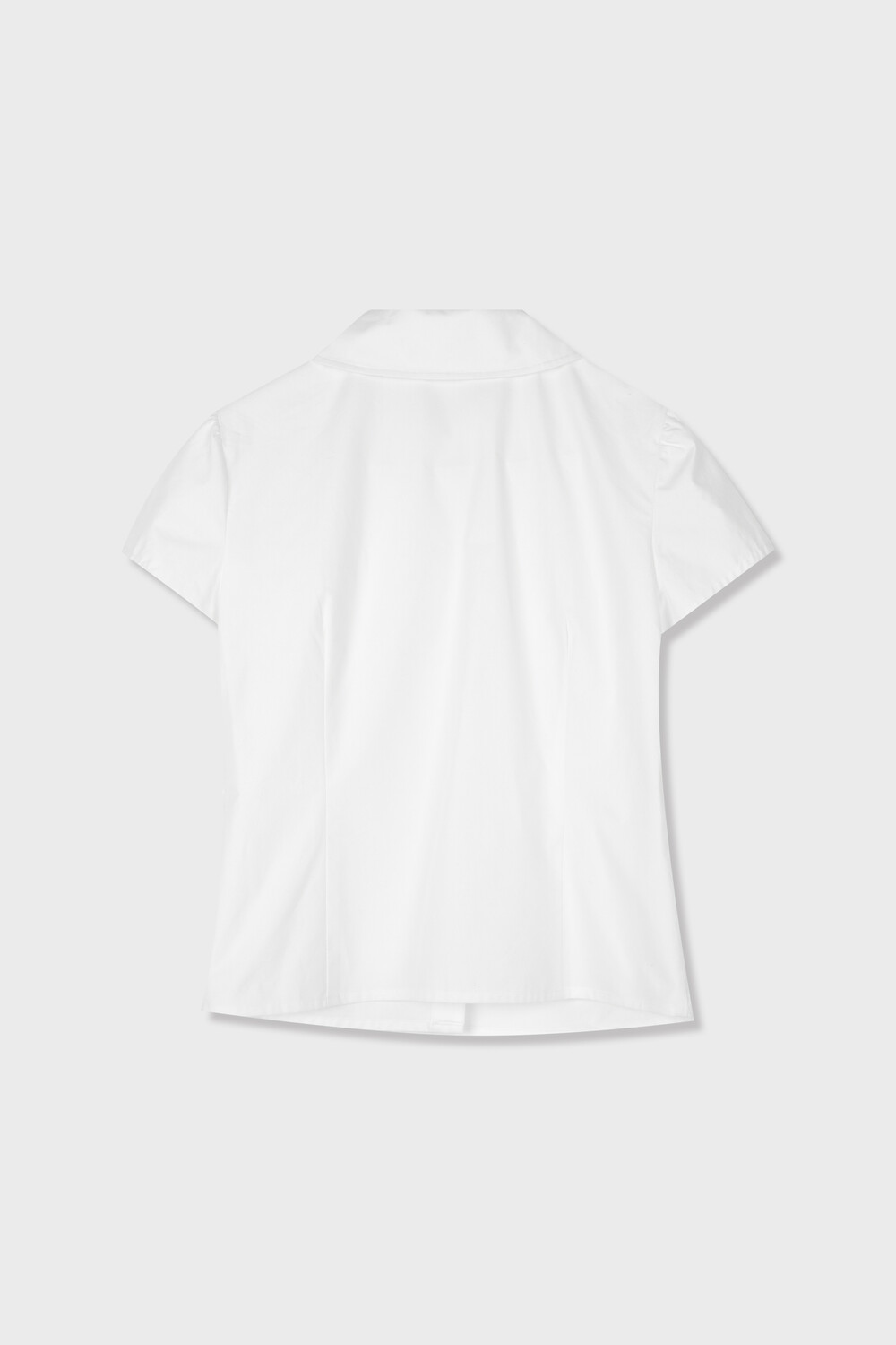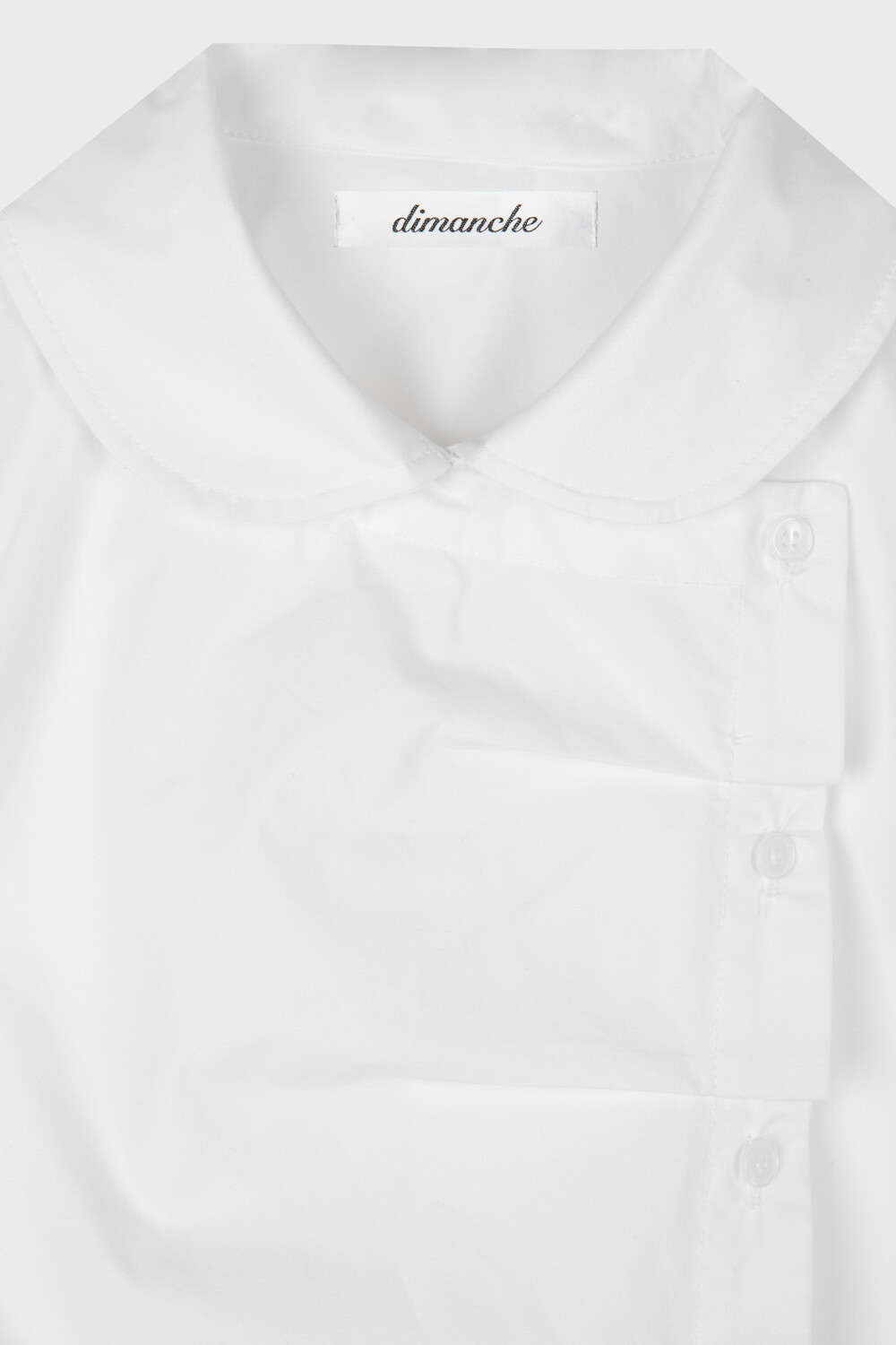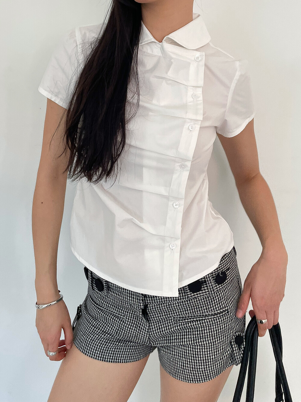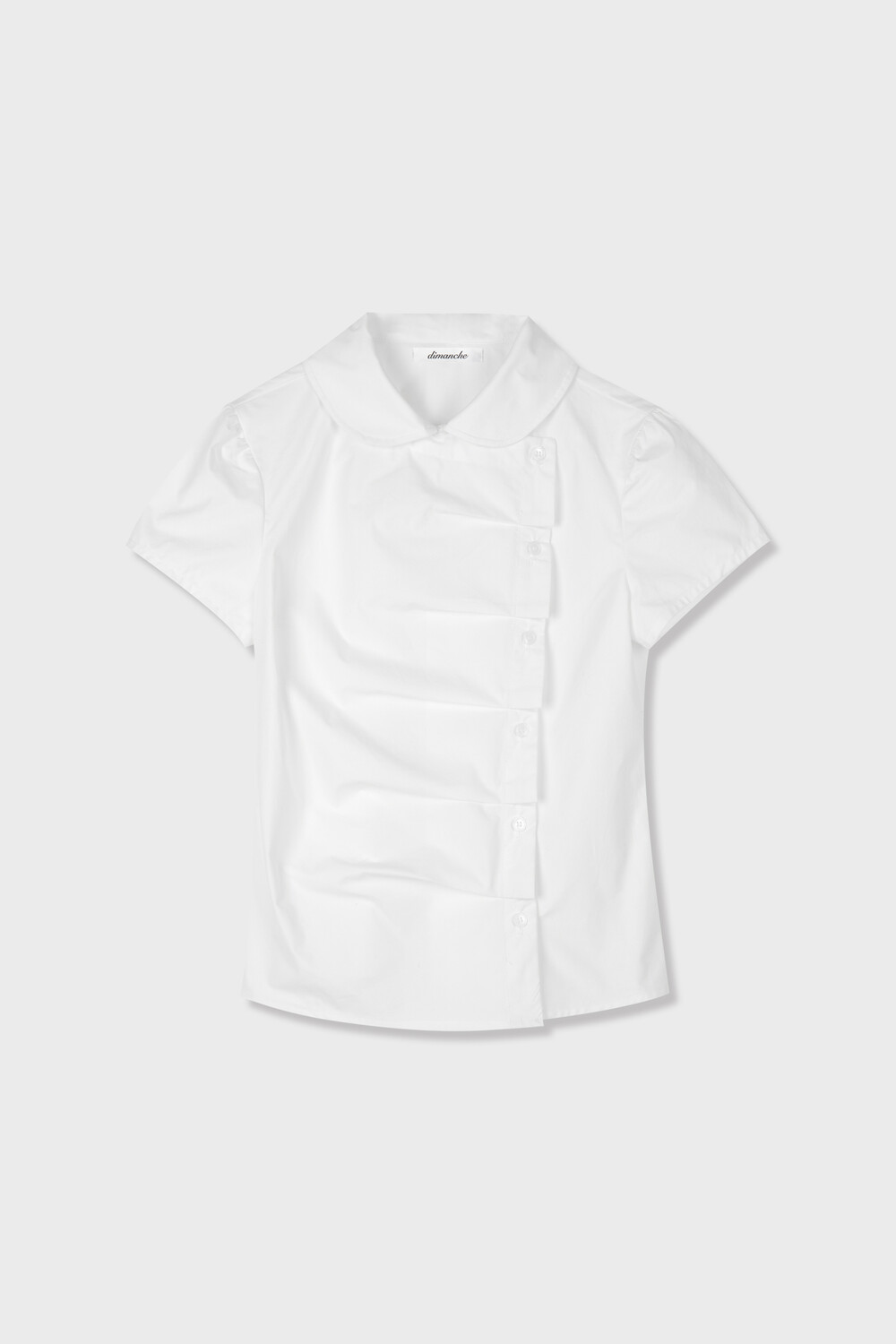 사선으로 배치된 프론트 버튼 라인이 돋보이는 구조적인 디자인의 셔츠입니다. 버튼을 여몄을 때 프론트에 자연스럽게 형성되는 카울 형태의 플리츠 디테일이 입체적인 실루엣을 만들어주며 깔끔한 화이트 컬러 원단과 어우러져 더욱 정돈된 분위기를 연출합니다. 오프닝 안쪽에는 내부 고정 단추를 더해 드레이프 형태가 흐트러지지 않도록 안정적으로 잡아줍니다. 둥글게 굴린 카라와 짧은 컵소매 라인이 더해져 단정하면서도 사랑스러운 무드를 완성하며 단독 착용만으로도 스타일리시한 연출이 가능한 아이템입니다.