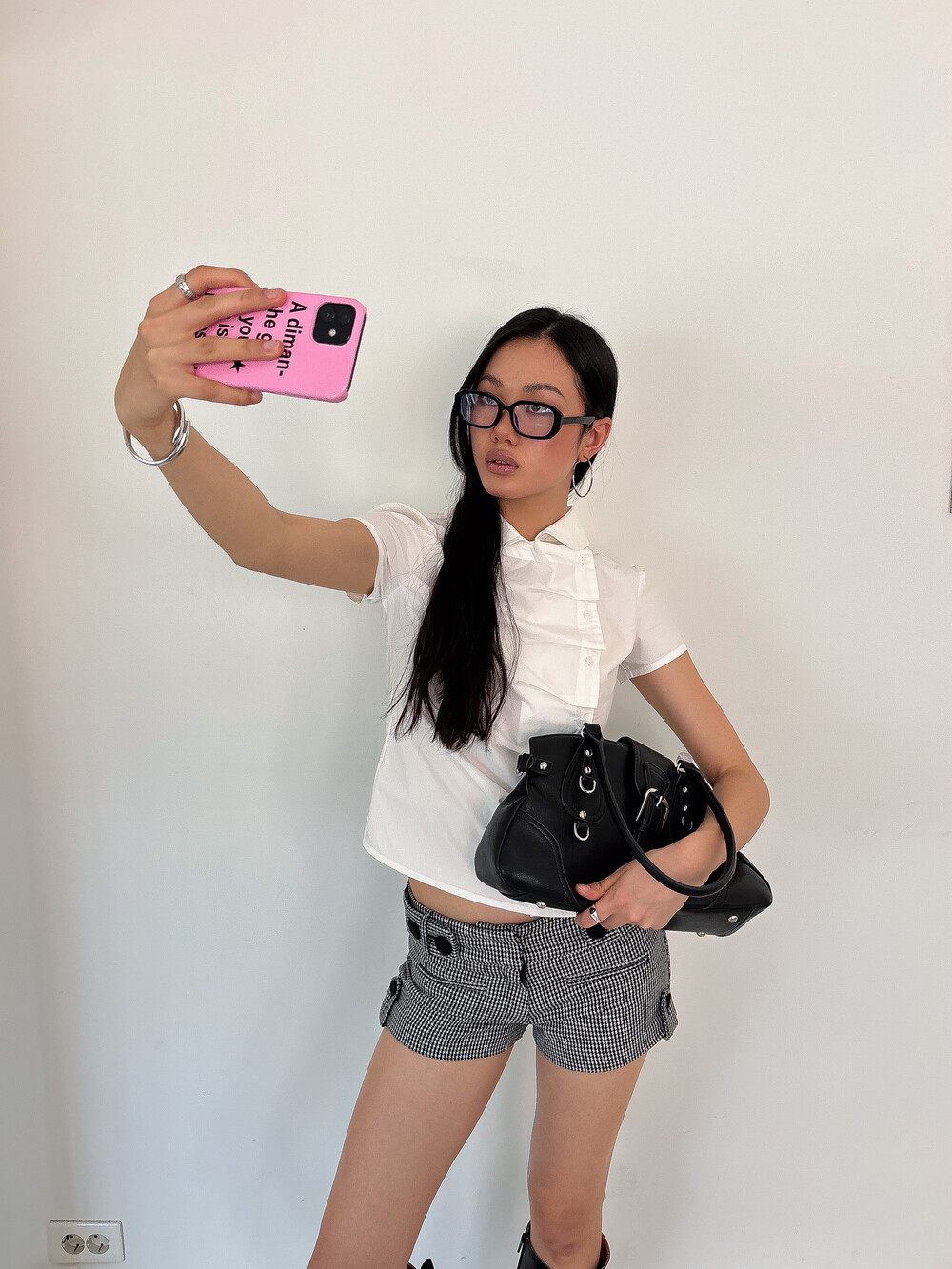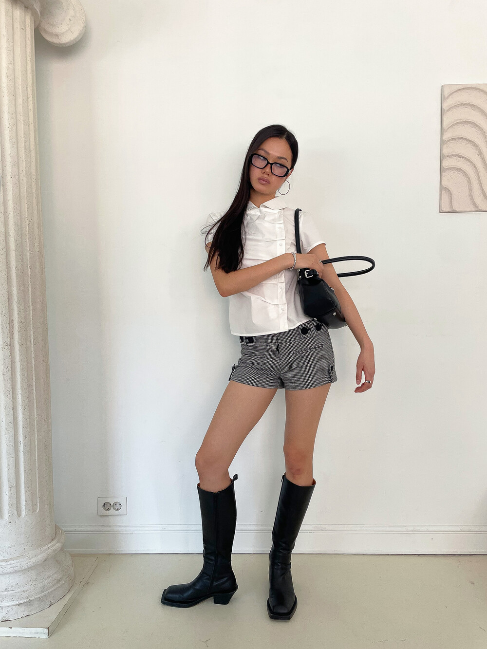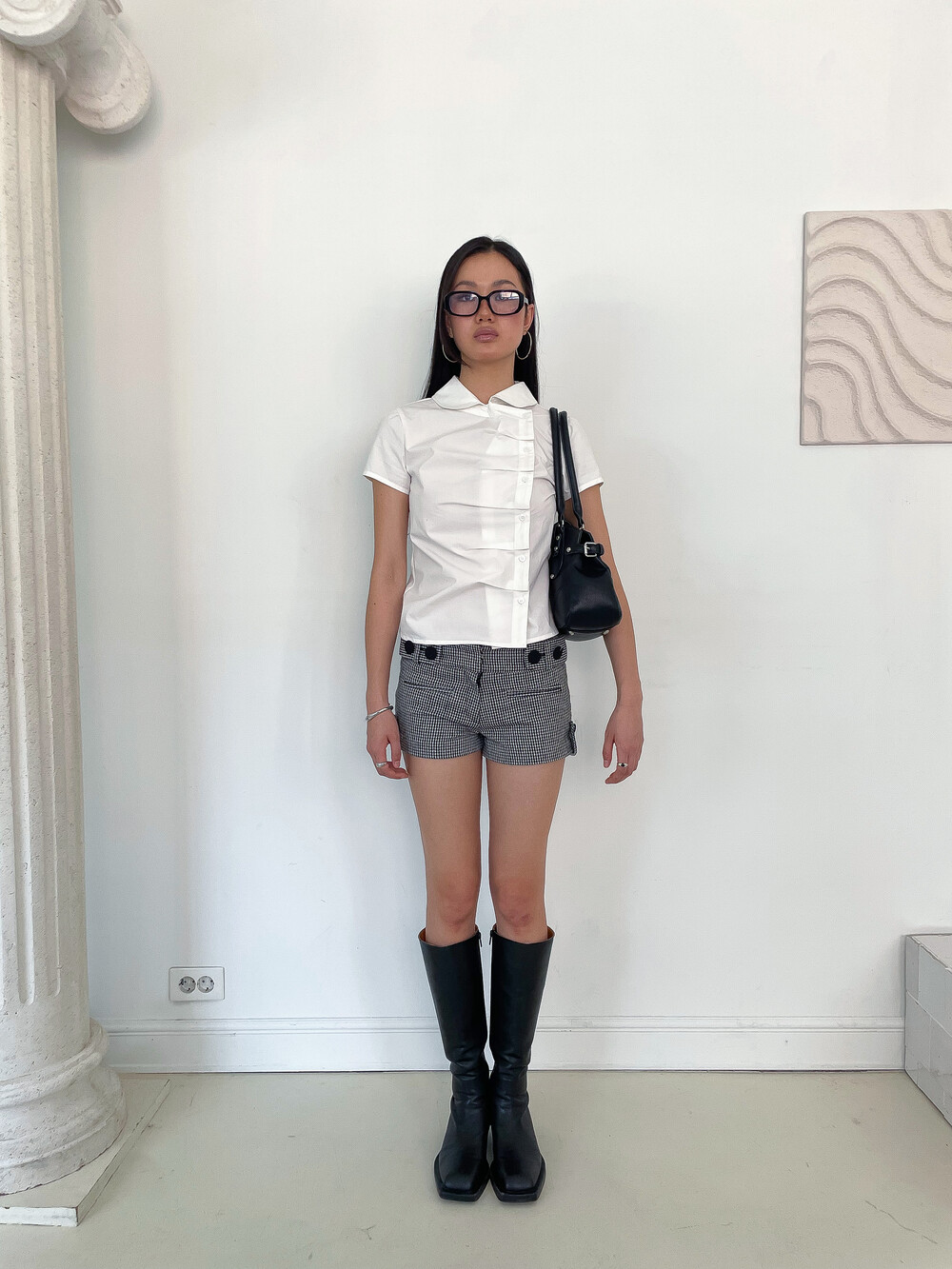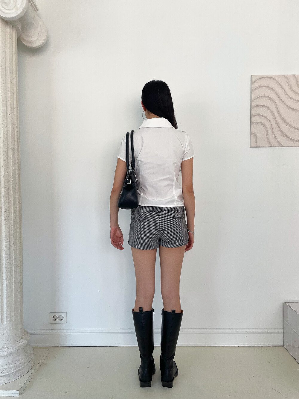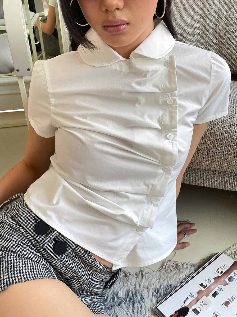 사선으로 배치된 프론트 버튼 라인이 돋보이는 구조적인 디자인의 셔츠입니다. 버튼을 여몄을 때 프론트에 자연스럽게 형성되는 카울 형태의 플리츠 디테일이 입체적인 실루엣을 만들어주며 깔끔한 화이트 컬러 원단과 어우러져 더욱 정돈된 분위기를 연출합니다. 오프닝 안쪽에는 내부 고정 단추를 더해 드레이프 형태가 흐트러지지 않도록 안정적으로 잡아줍니다. 둥글게 굴린 카라와 짧은 컵소매 라인이 더해져 단정하면서도 사랑스러운 무드를 완성하며 단독 착용만으로도 스타일리시한 연출이 가능한 아이템입니다.