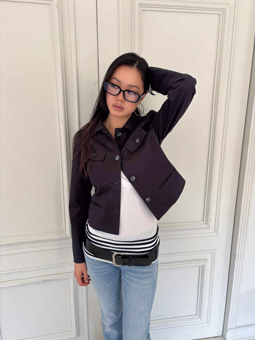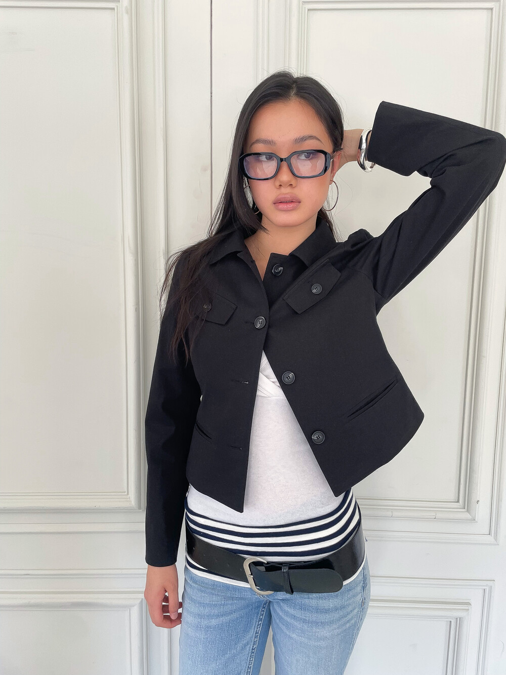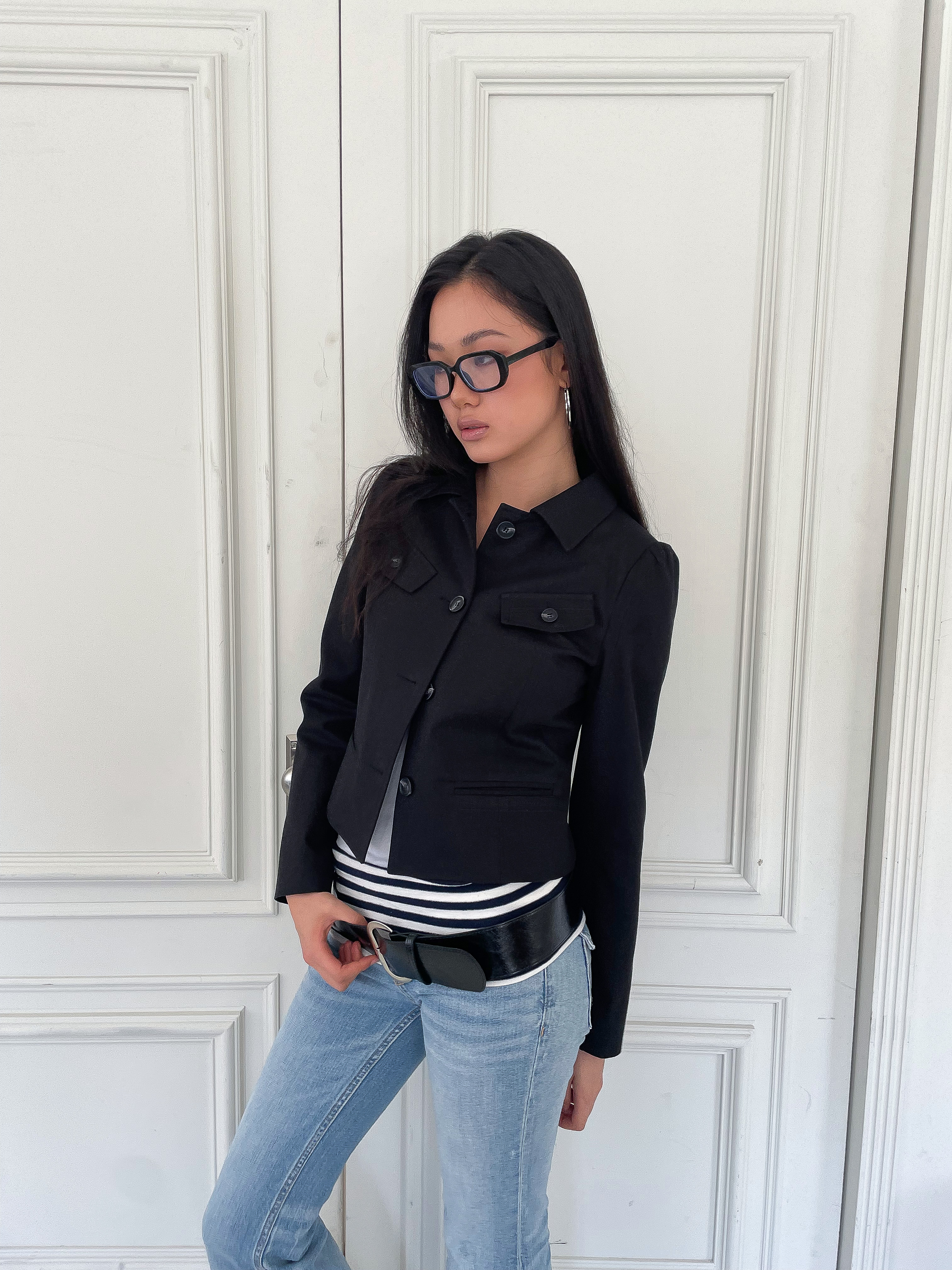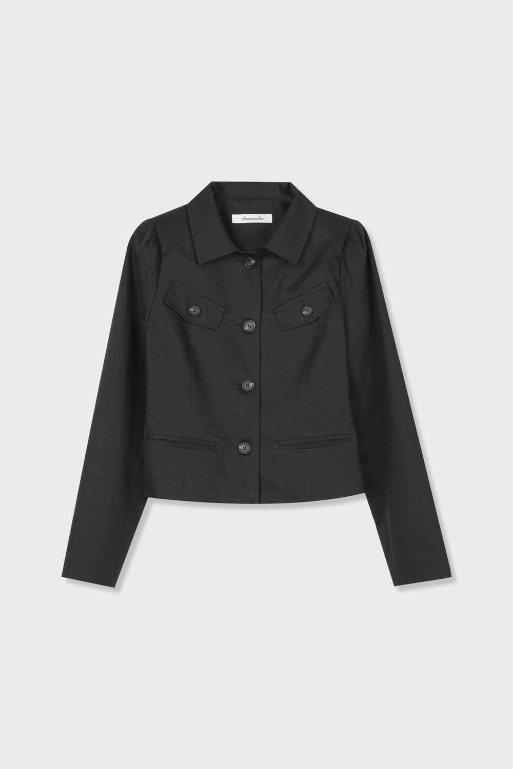 DESCRIPTION -몸에 부드럽게 밀착되는 슬림한 핏의 실루엣 -짧은 기장과 대비되는 긴 소매 라인이 주는 빈티지한 무드 -양쪽 가슴 포켓 디테일 -어깨 라인의 은은한 셔링으로 입체적인 볼륨감 구현