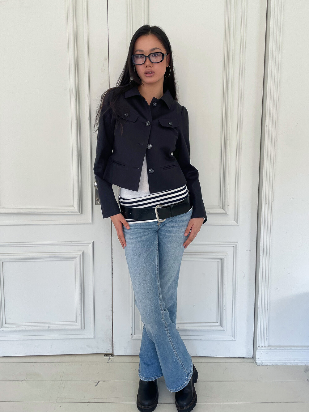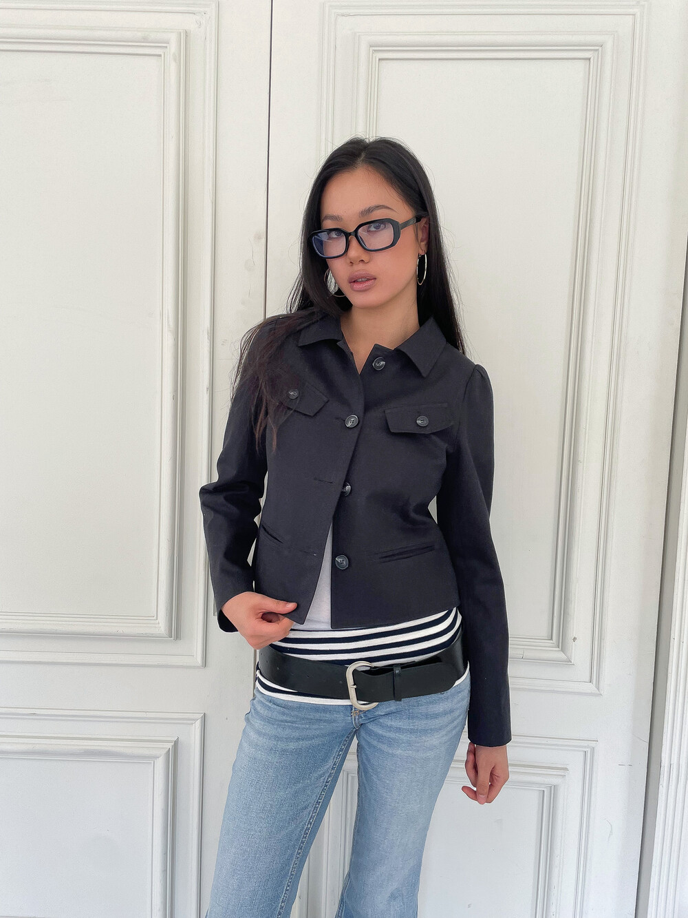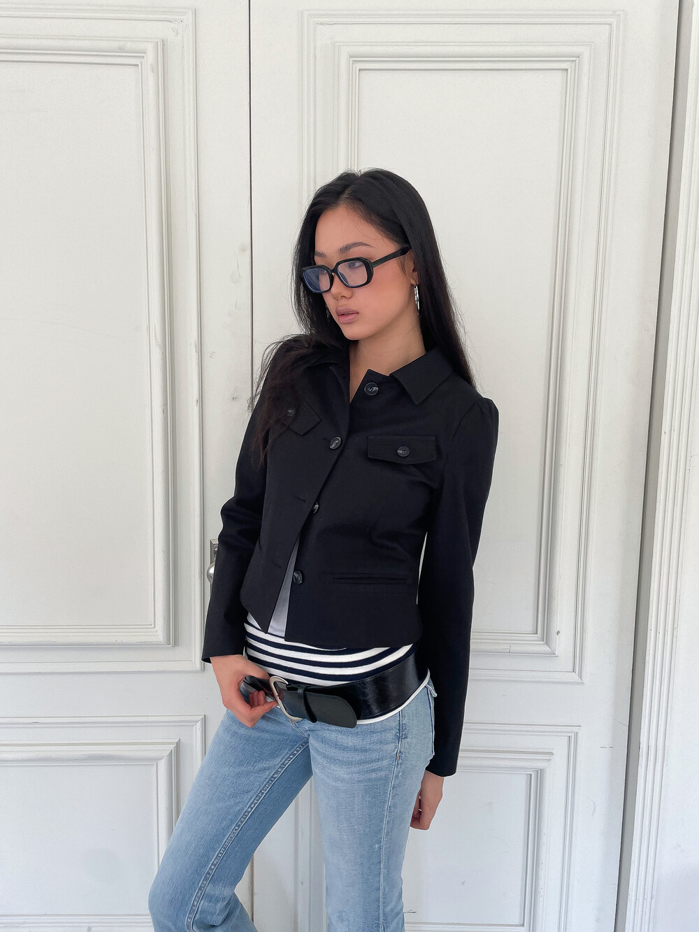 몸에 핏하게 떨어지는 실루엣과 감각적인 포켓 배치가 특징적인 자켓입니다. 짧은 바디 기장에 긴 소매를 매치하여 빈티지하면서도 세련된 비율을 완성하며, 상단의 뚜껑이 있는 플랩 포켓과 하단의 깔끔한 웰트 포켓이 시각적인 재미를 더해줍니다. 탄탄한 원단감이 블랙 컬러의 선명한 실루엣을 잘 유지해 주어 다양한 하의와 함께 매치했을 때 더욱 감각적인 스타일을 보여주는 레이어드가 가능한 아이템입니다.