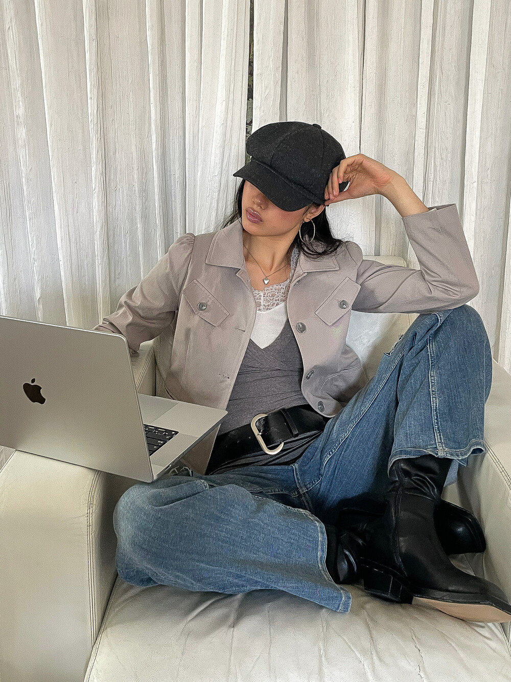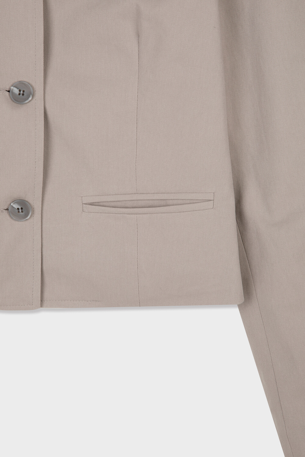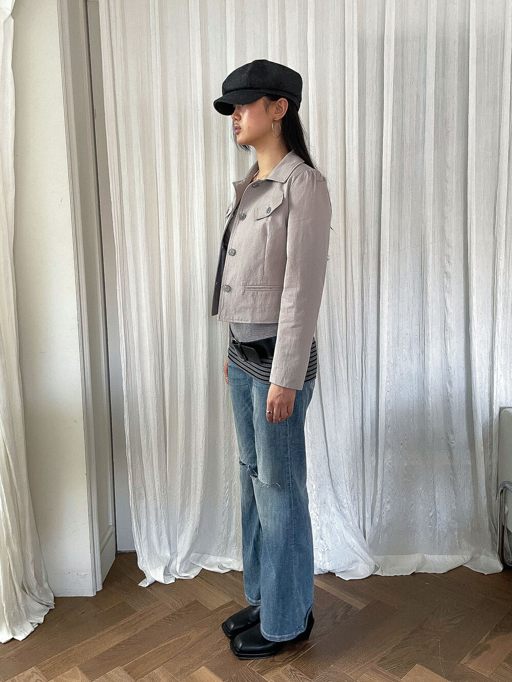 -짧은 기장과 대비되는 긴 소매 라인이 주는 빈티지한 무드