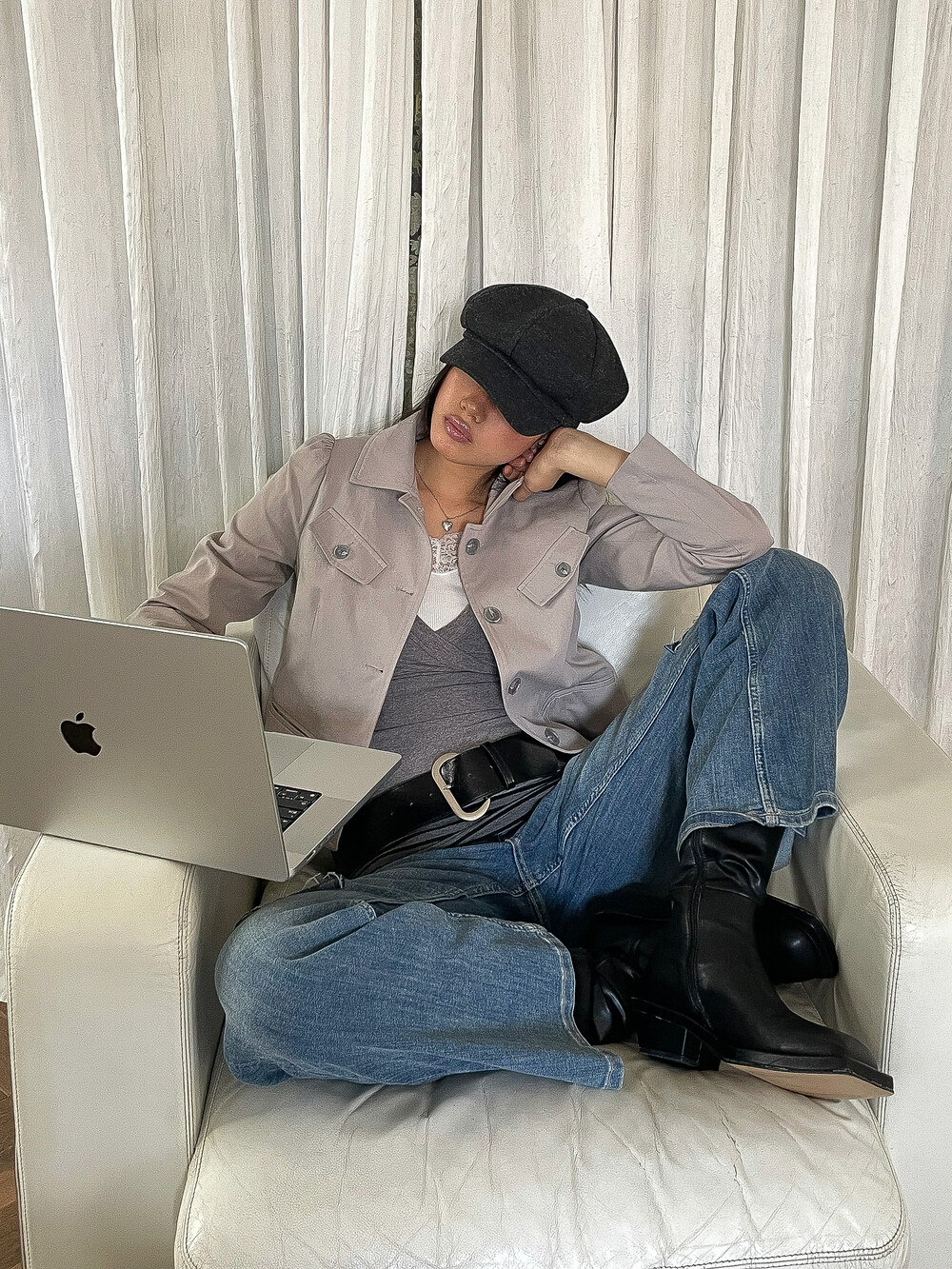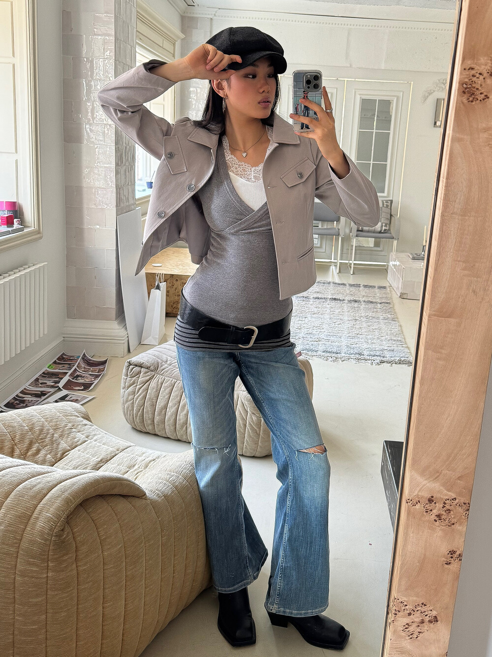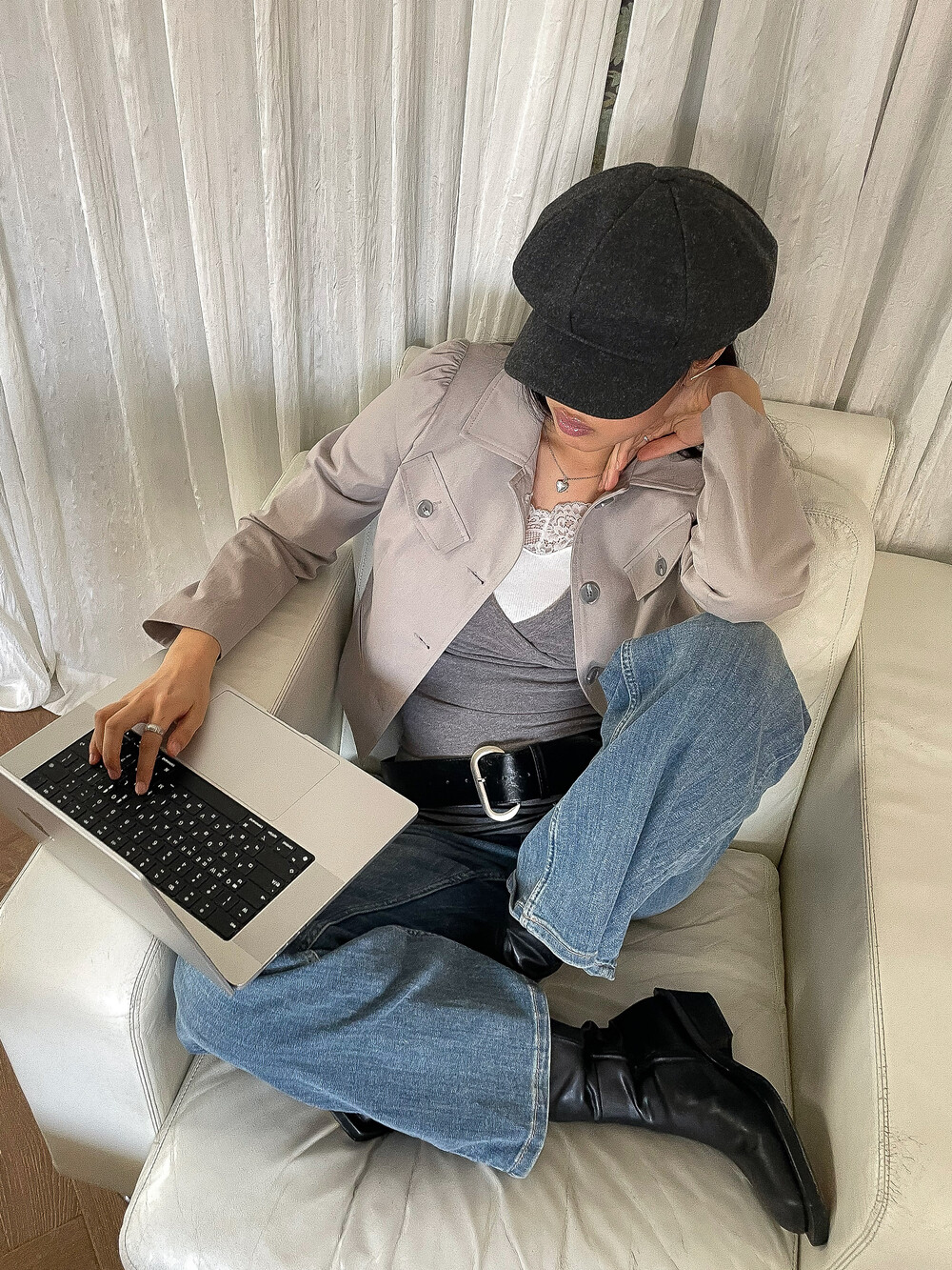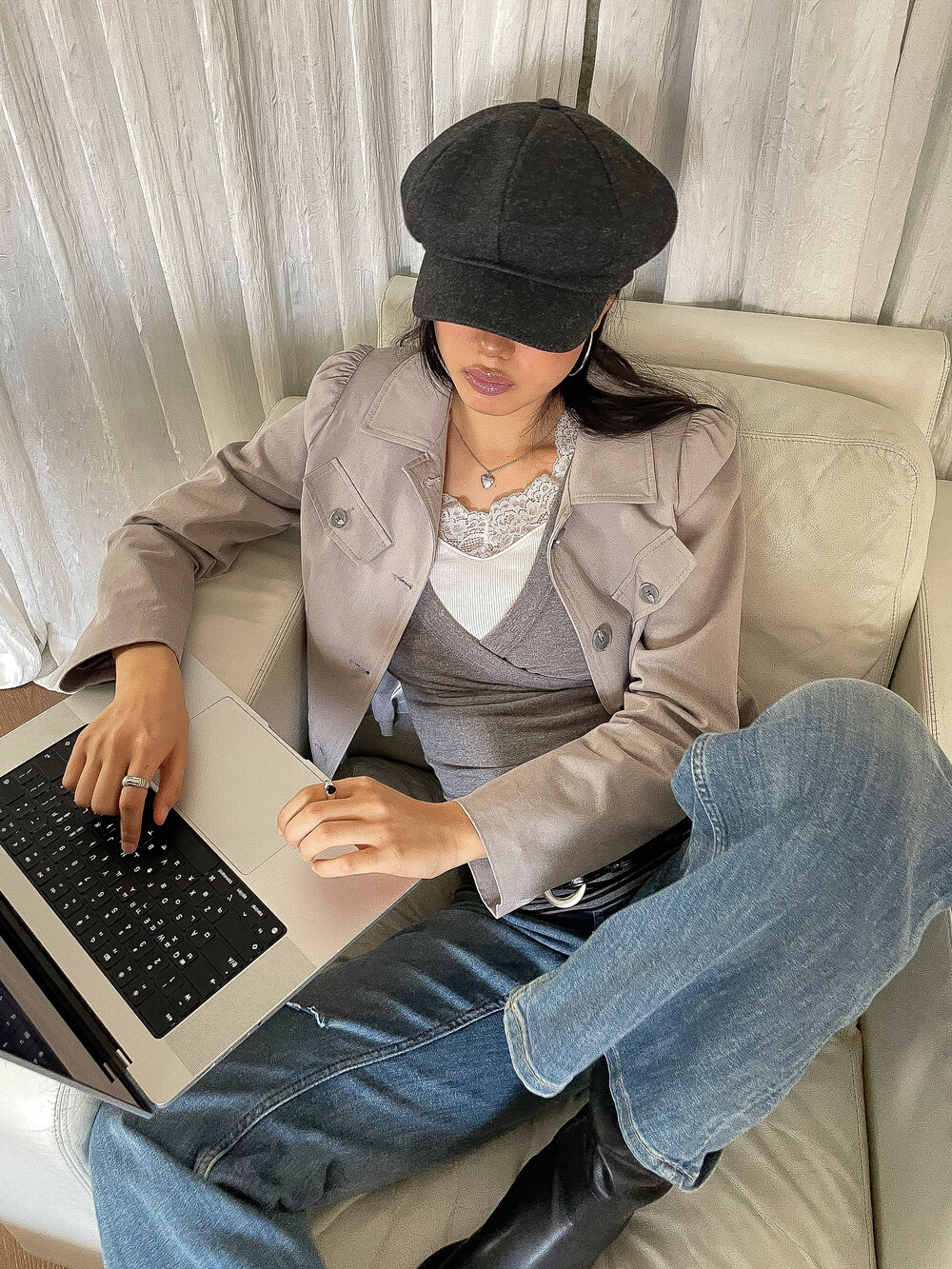 -짧은 기장과 대비되는 긴 소매 라인이 주는 빈티지한 무드