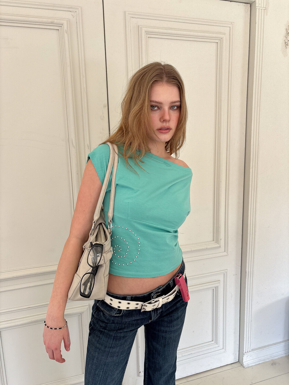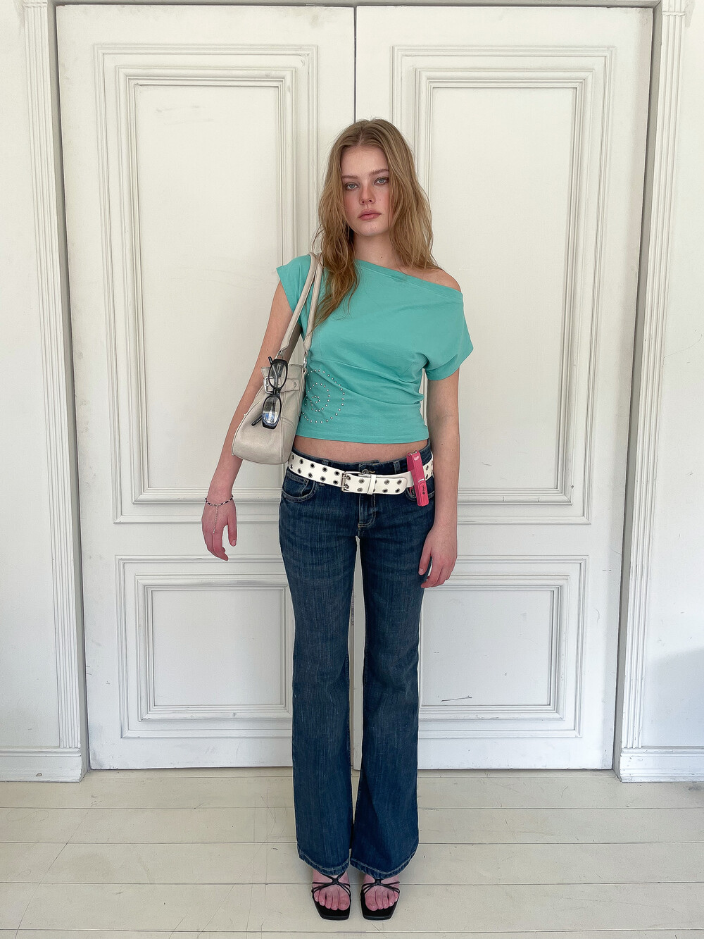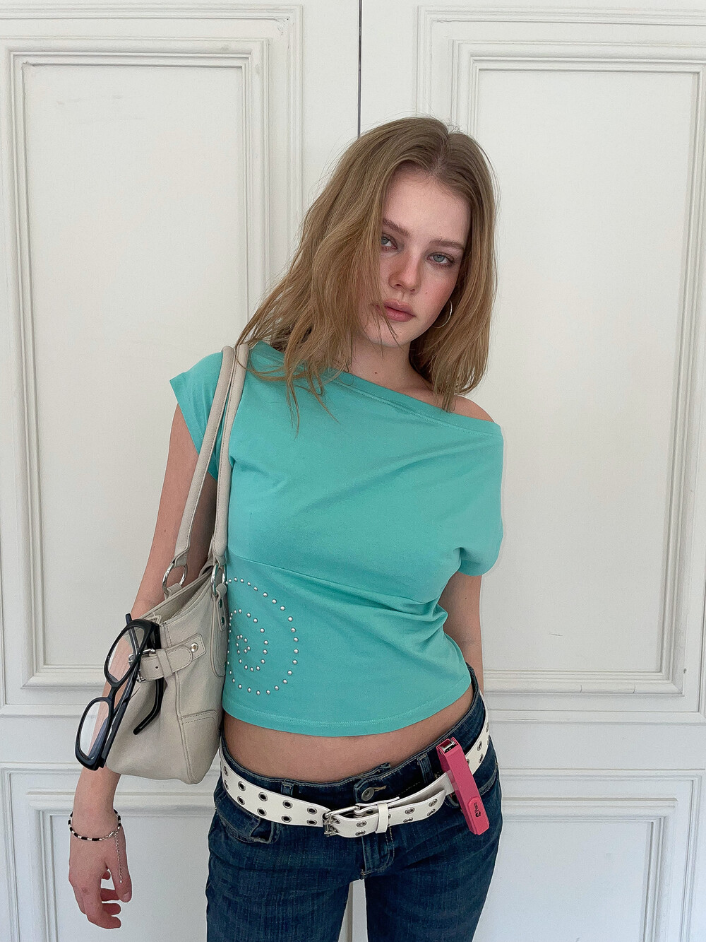 측면에 배치된 핫픽스 디테일이 시각적인 포인트를 더해주는 화이트 컬러의 탑입니다. 어깨 라인이 자연스럽게 늘어져 연출에 따라 원숄더나 오프숄더로 착용할 수 있으며 가슴 부분의 다트와 하단 절개선이 몸의 곡선을 입체적으로 잡아줍니다. 미니멀하면서도 감각적인 실루엣을 완성하는 아이템입니다.