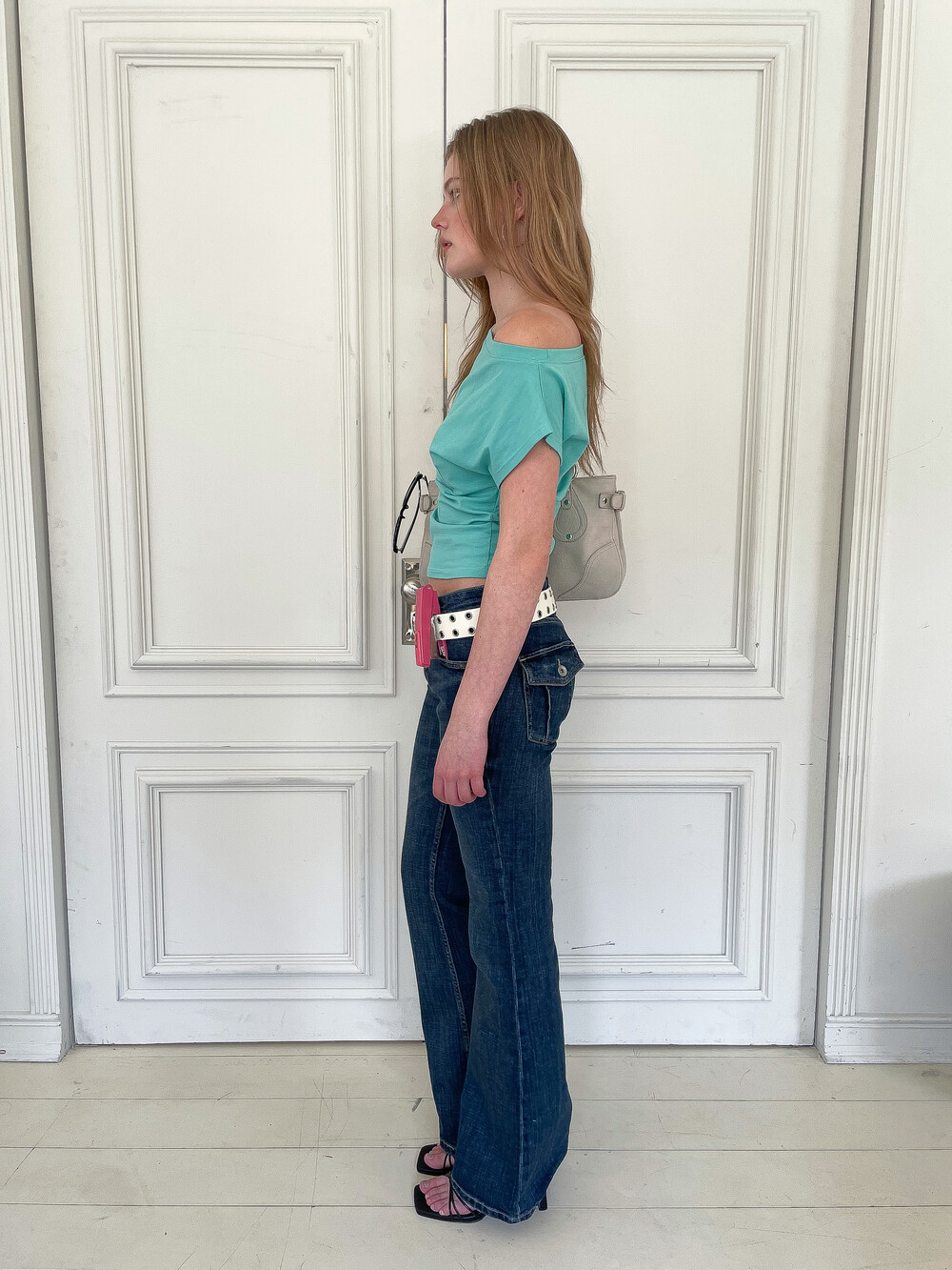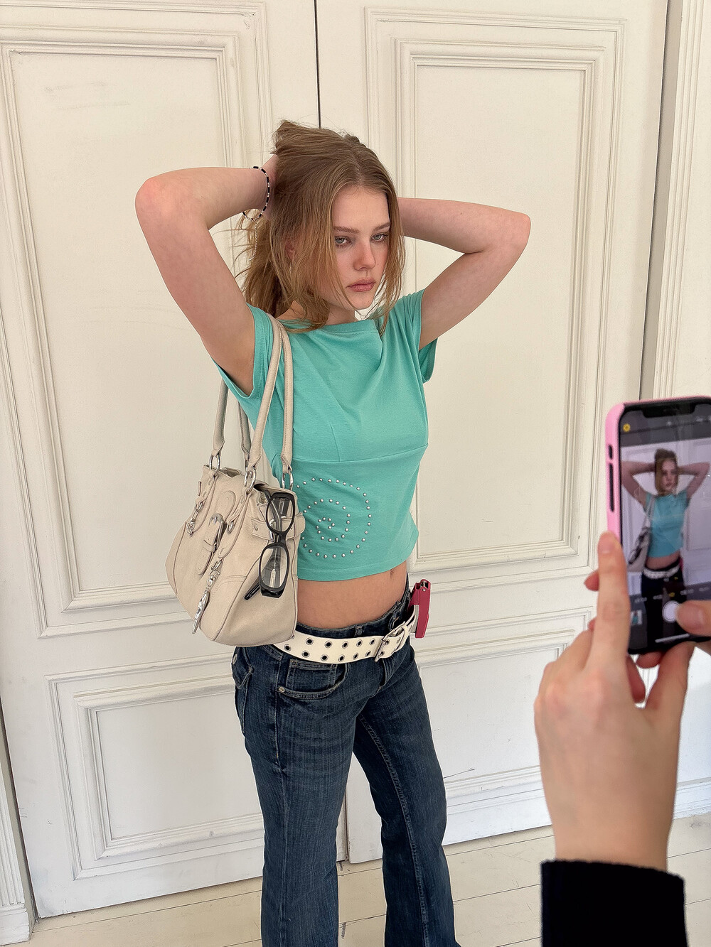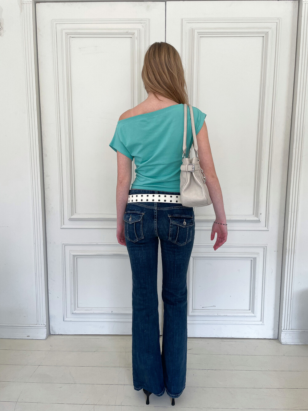 측면에 배치된 핫픽스 디테일이 시각적인 포인트를 더해주는 화이트 컬러의 탑입니다. 어깨 라인이 자연스럽게 늘어져 연출에 따라 원숄더나 오프숄더로 착용할 수 있으며 가슴 부분의 다트와 하단 절개선이 몸의 곡선을 입체적으로 잡아줍니다. 미니멀하면서도 감각적인 실루엣을 완성하는 아이템입니다.