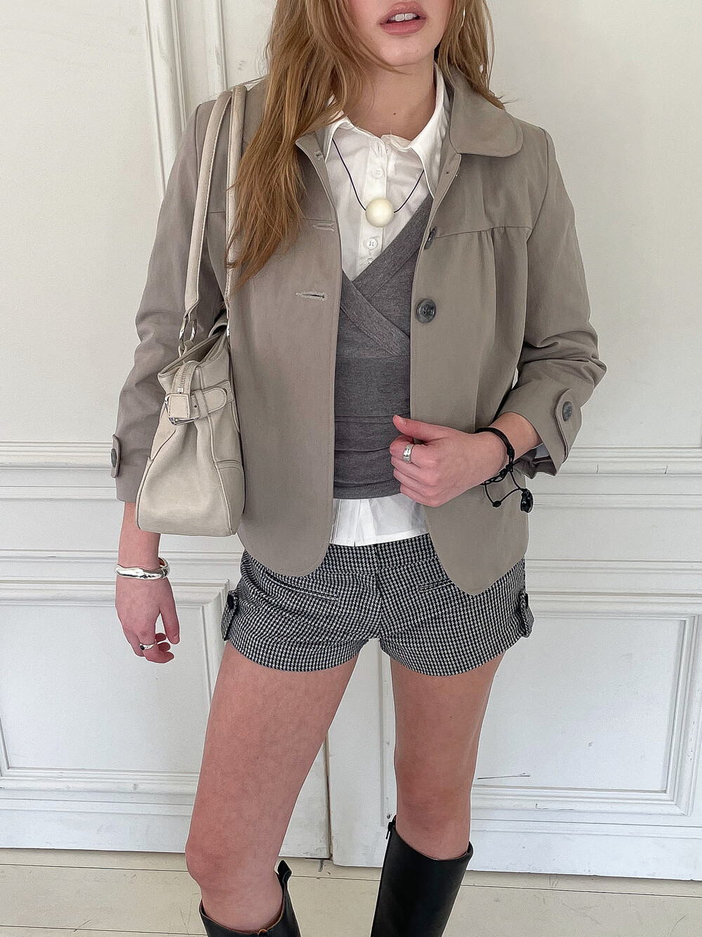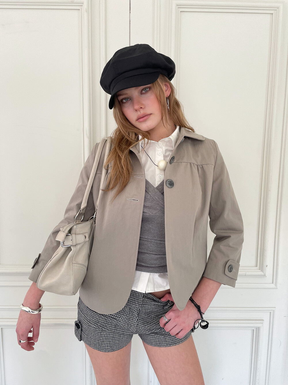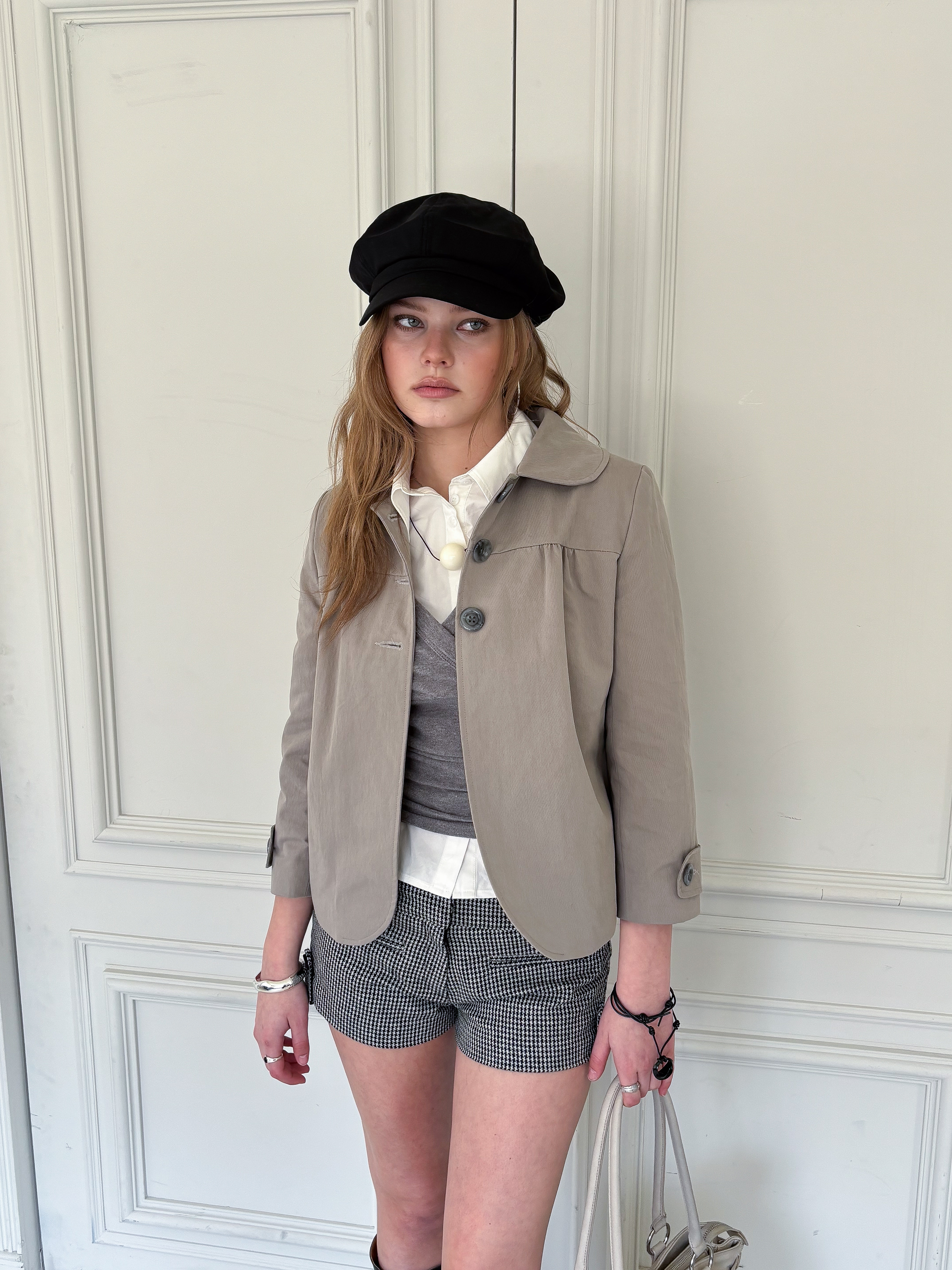 뒷판 절개선으로 허리 라인이 슬림해 보이며 소매에는 버튼 비조 디테일이 더해졌습니다. 다양한 스타일링에 활용하기 좋은 스프링 아우터입니다.