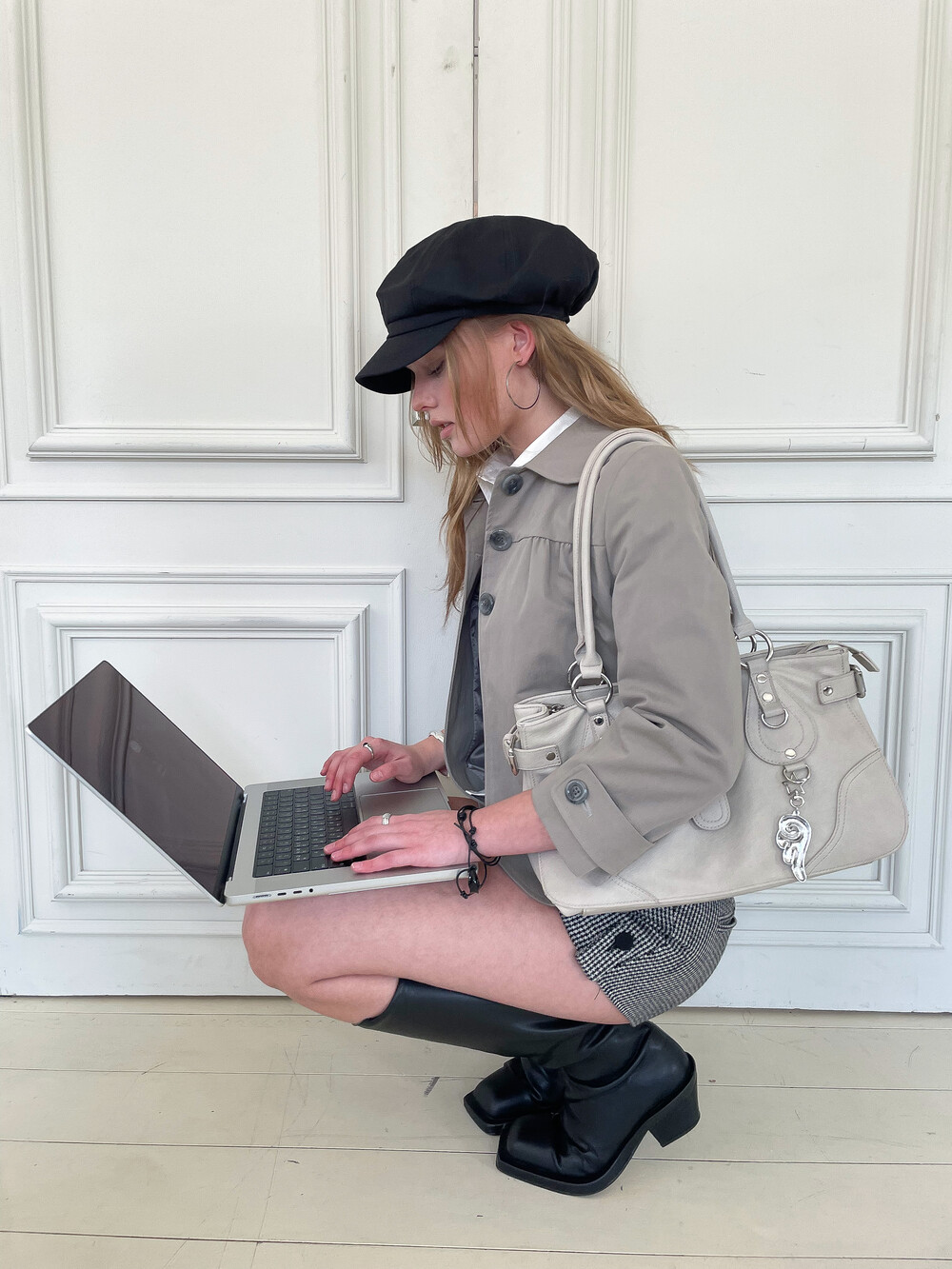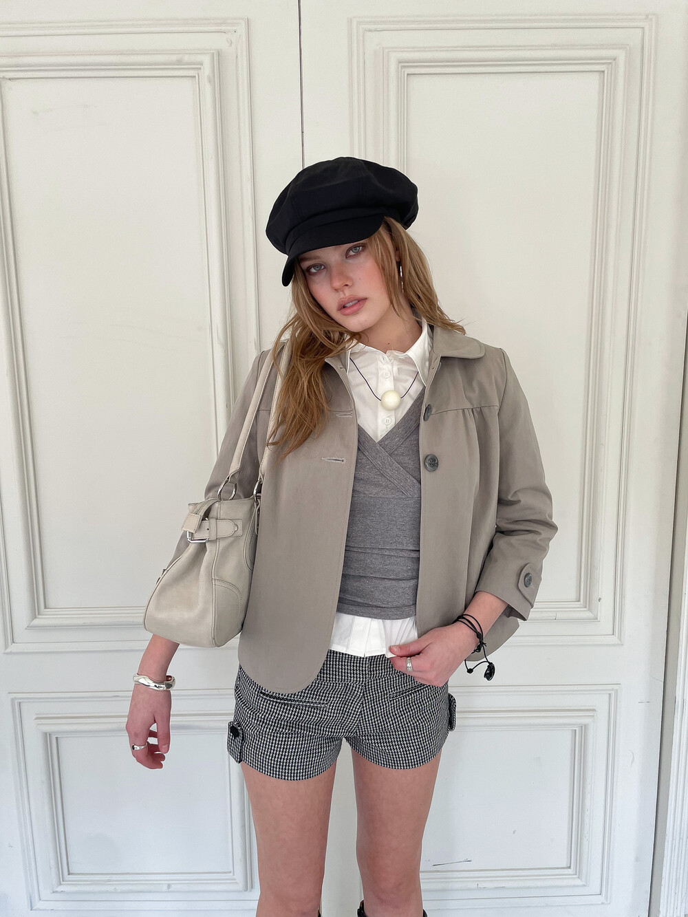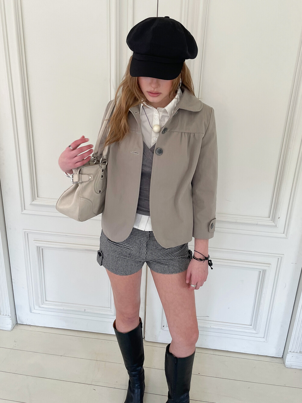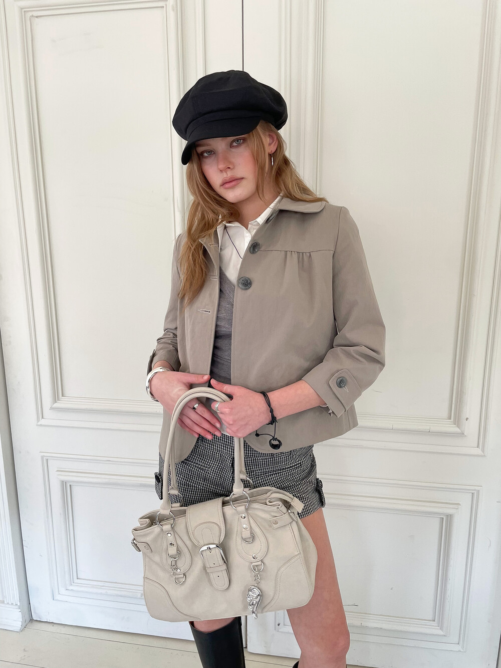 뒷판 절개선으로 허리 라인이 슬림해 보이며 소매에는 버튼 비조 디테일이 더해졌습니다. 다양한 스타일링에 활용하기 좋은 스프링 아우터입니다.