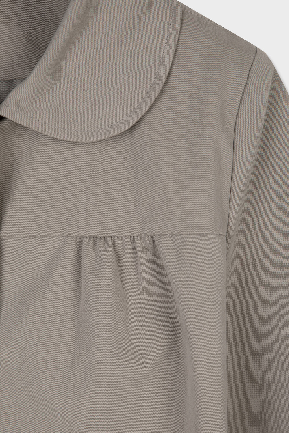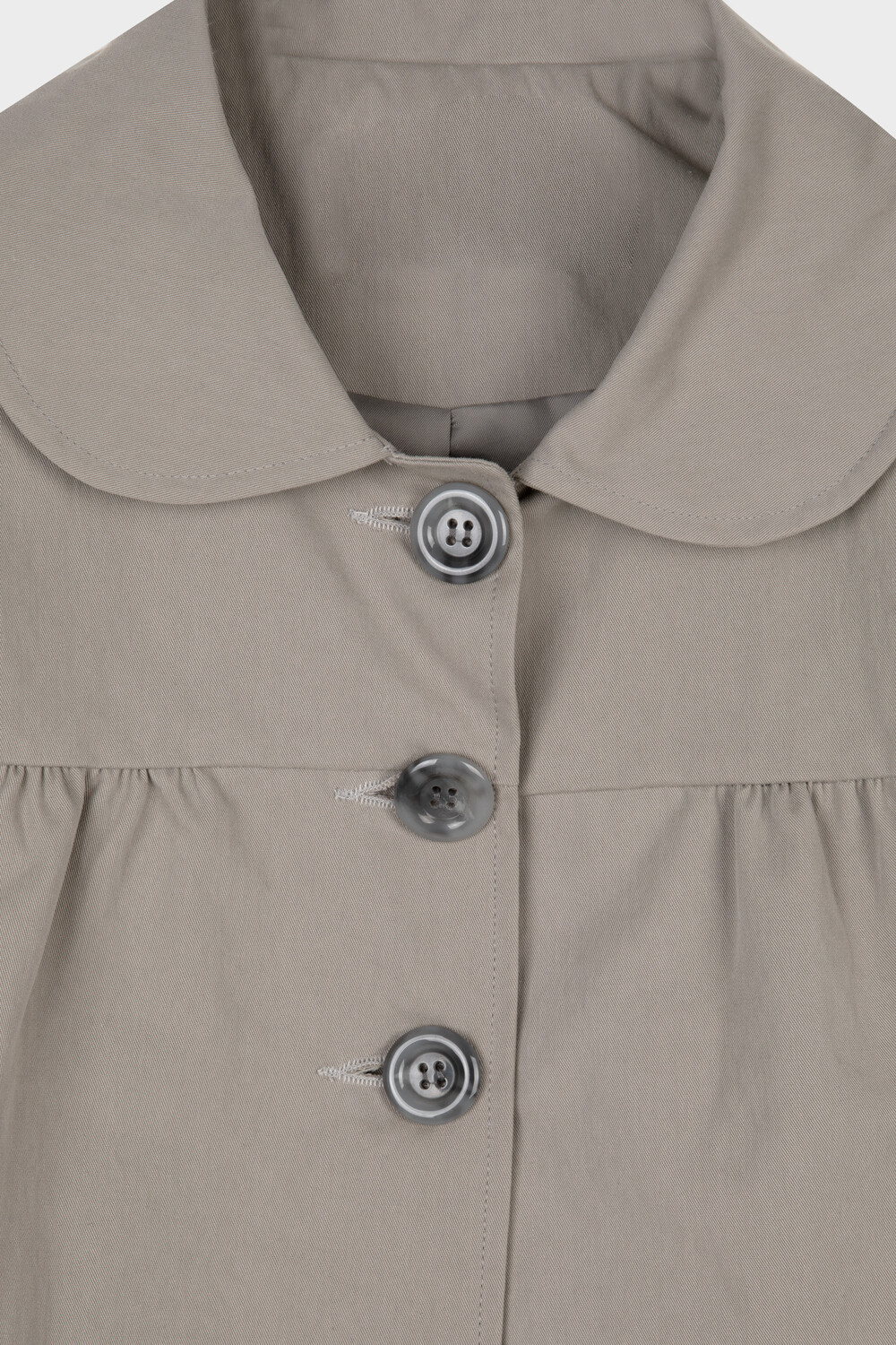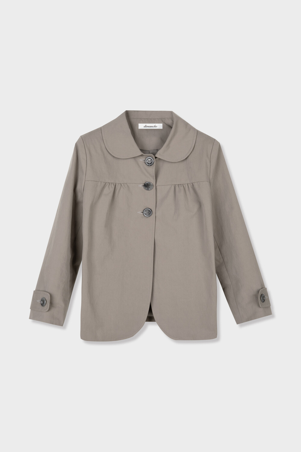 가볍고 탄탄한 소재로 제작된 스프링 자켓입니다. 둥글게 떨어지는 라운드 카라와 프론트 3버튼 클로징이 특징이며 가슴 절개선 아래 셔링 디테일을 더해 자연스러운 볼륨을 만듭니다.