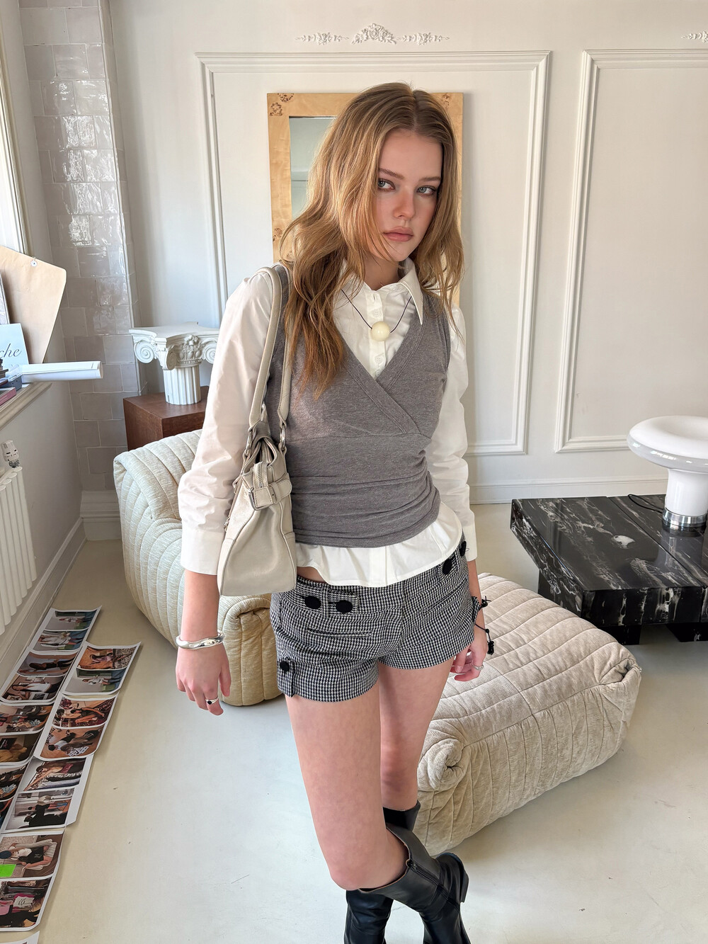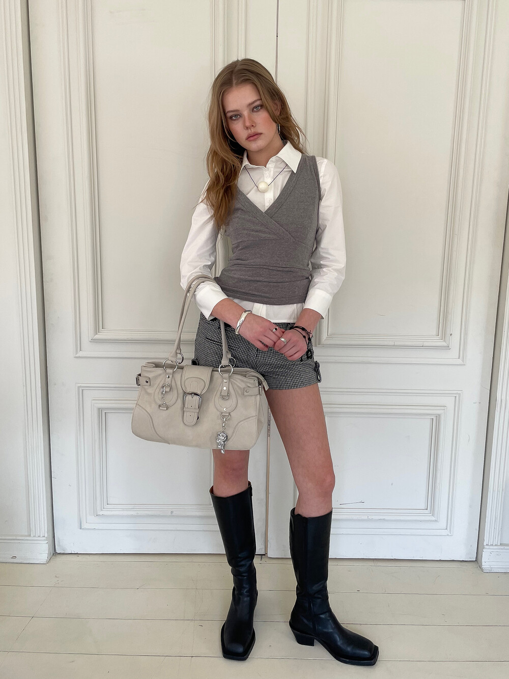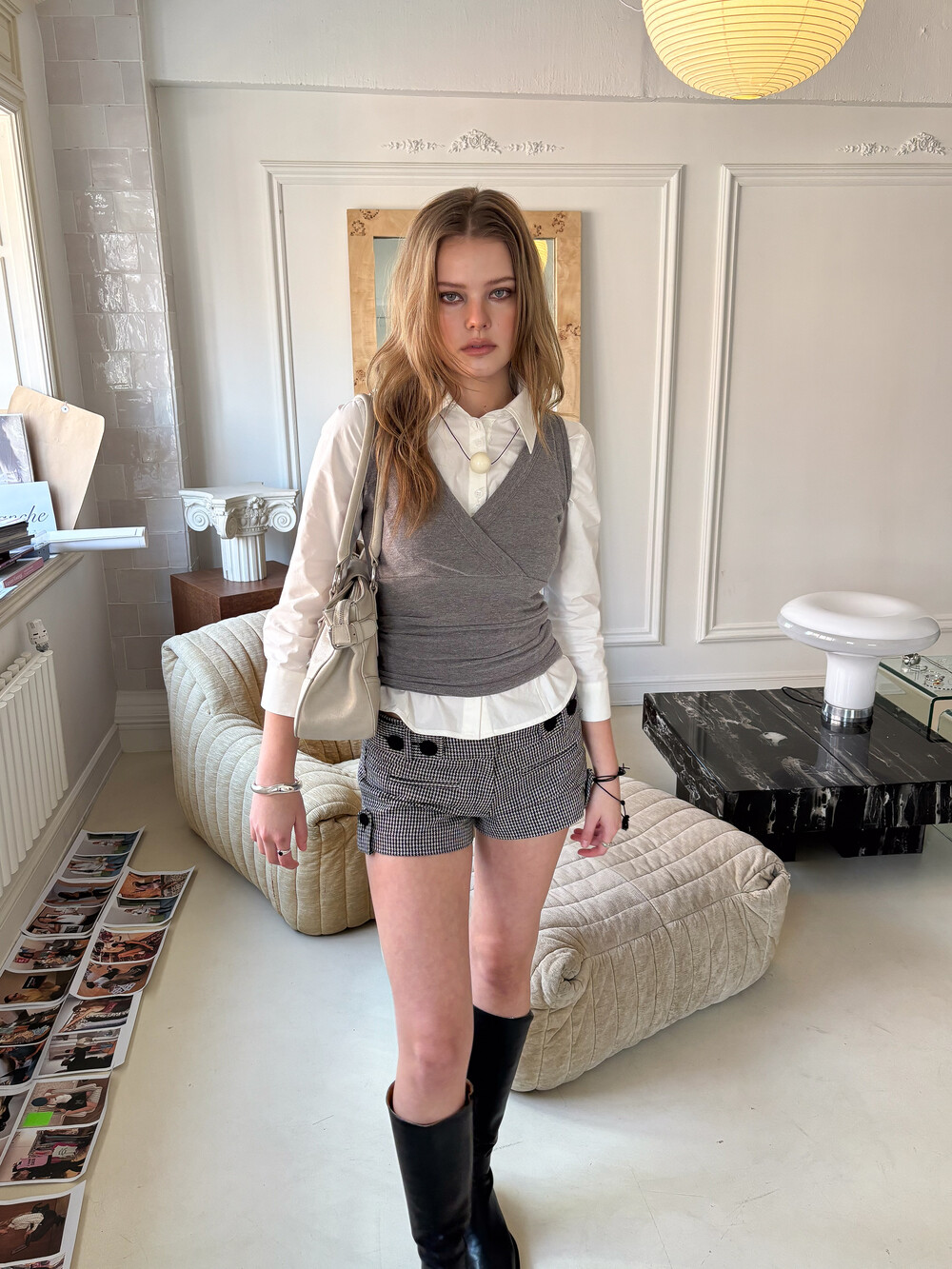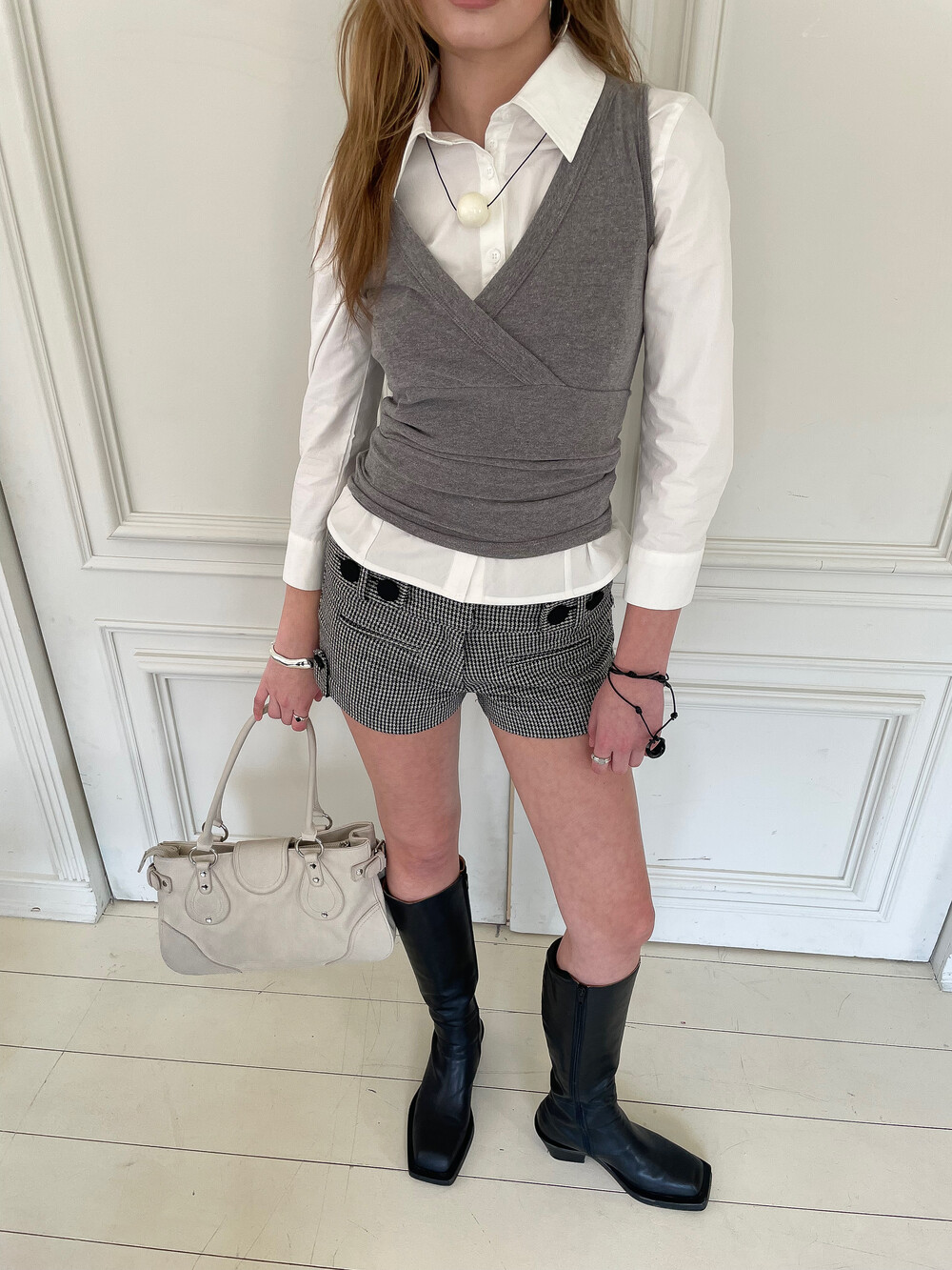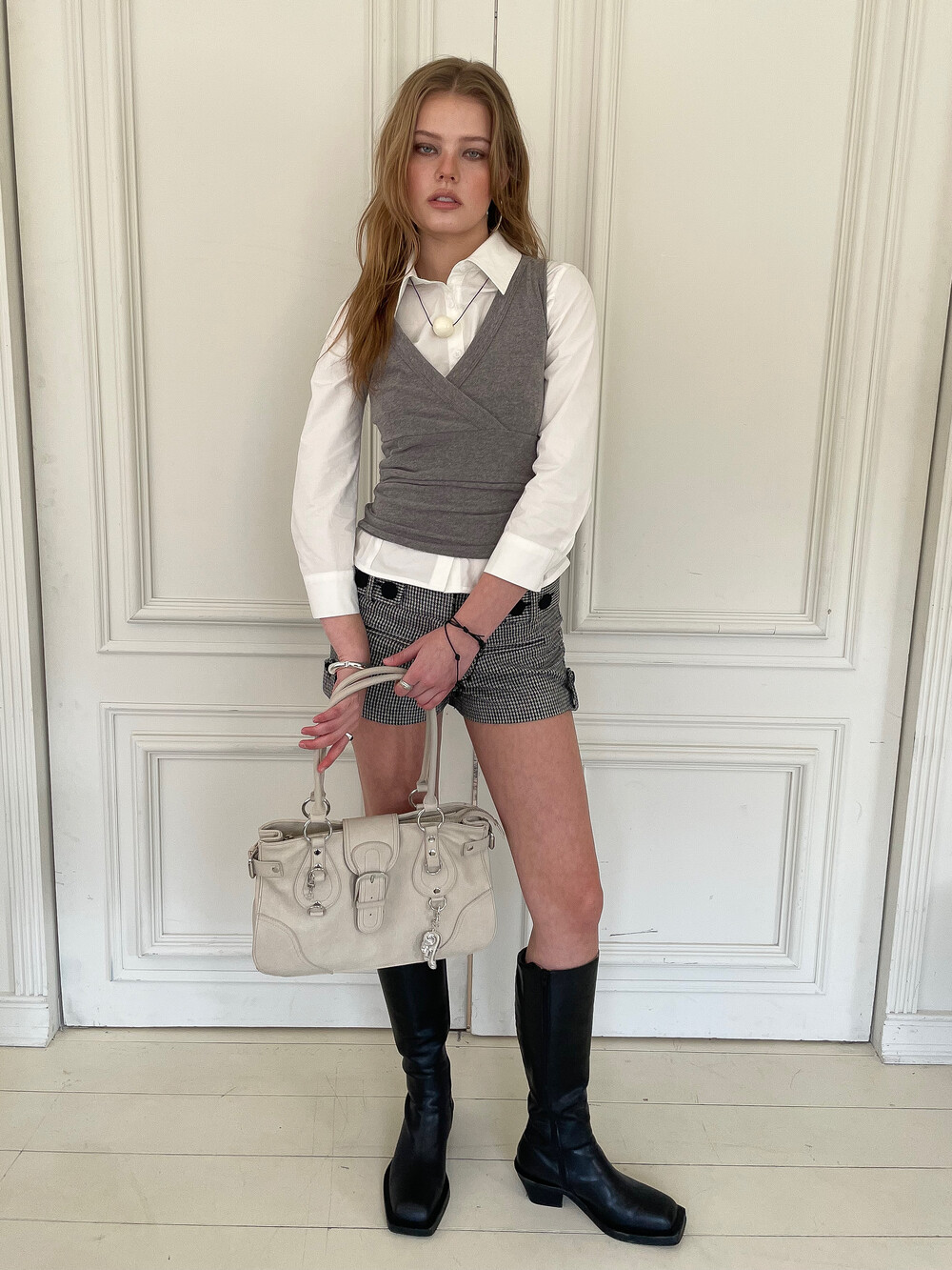 부드럽고 유연한 텍스처가 돋보이는 랩 가디건과 슬리브리스 탑으로 구성된 셋업입니다. 바디 라인을 자연스럽게 감싸는 슬림한 실루엣으로 여성스러운 분위기를 연출하며 허리 부분의 랩 구조와 리본 스트랩 디테일이 포인트가 됩니다. 슬리브리스 탑은 단독 착용은 물론 셔츠나 다양한 아이템 위에 레이어드하여 스타일링할 수 있어 활용도가 높습니다. 두 아이템을 함께 매치하면 완성도 있는 셋업 스타일을, 각각 단품으로도 다양한 코디에 활용할 수 있는 아이템입니다.