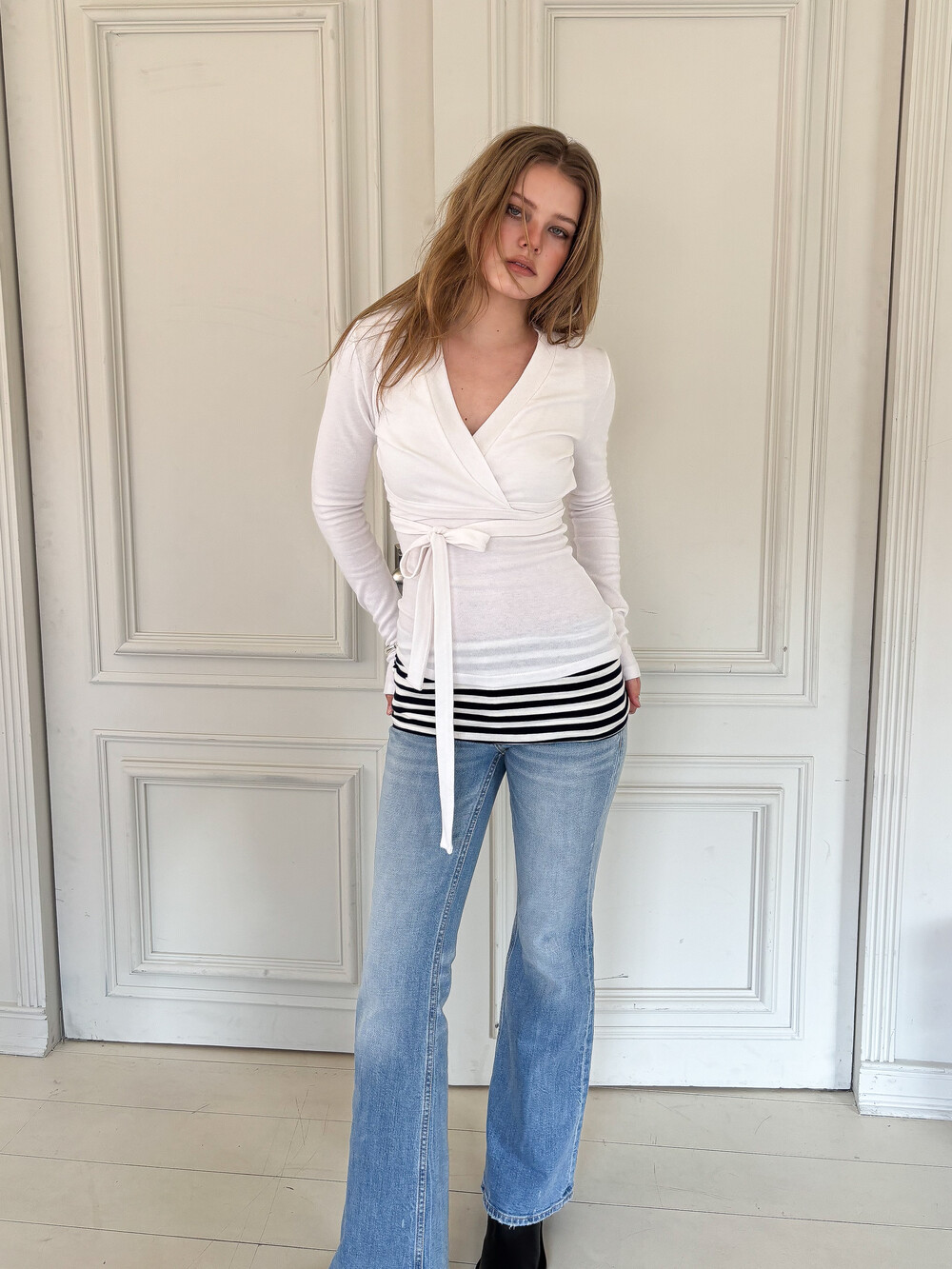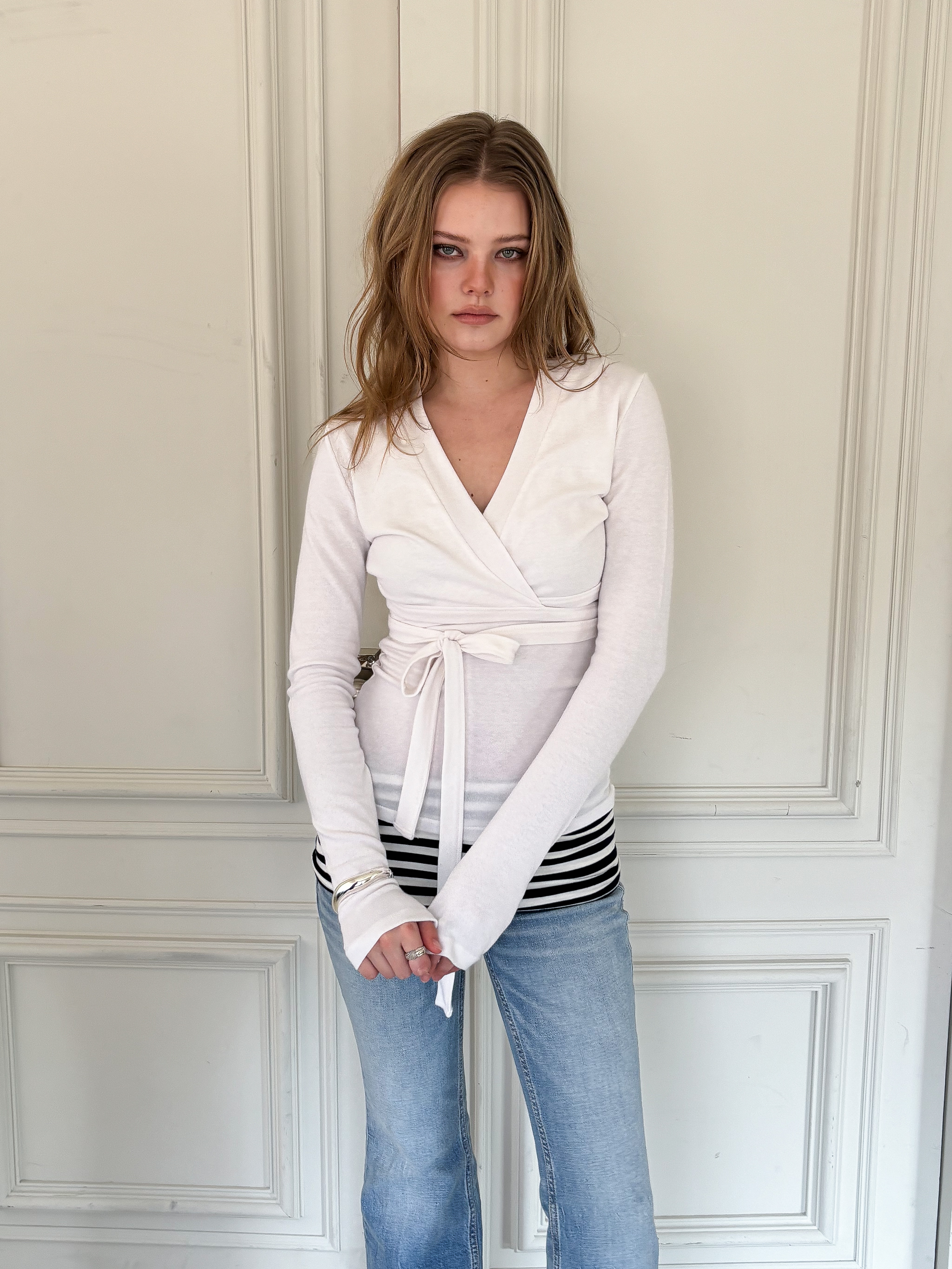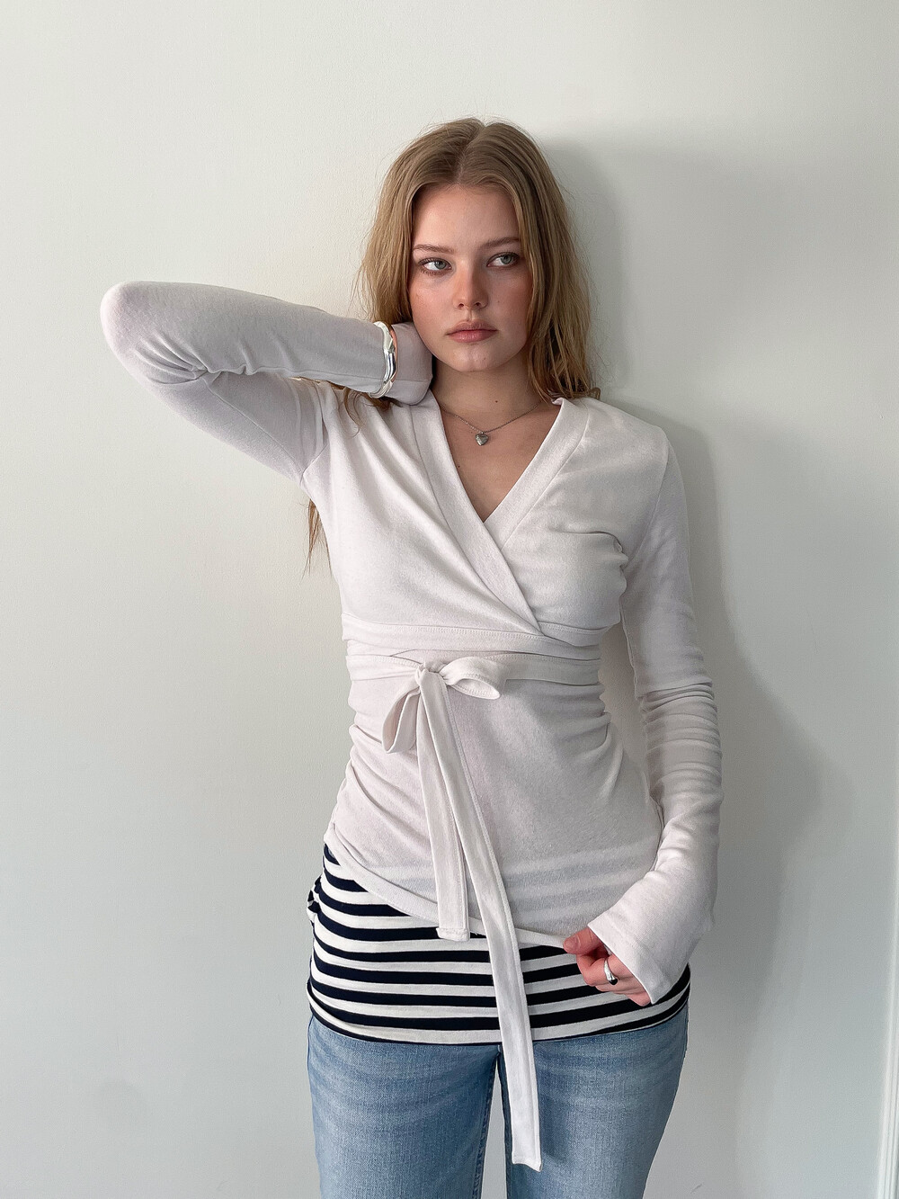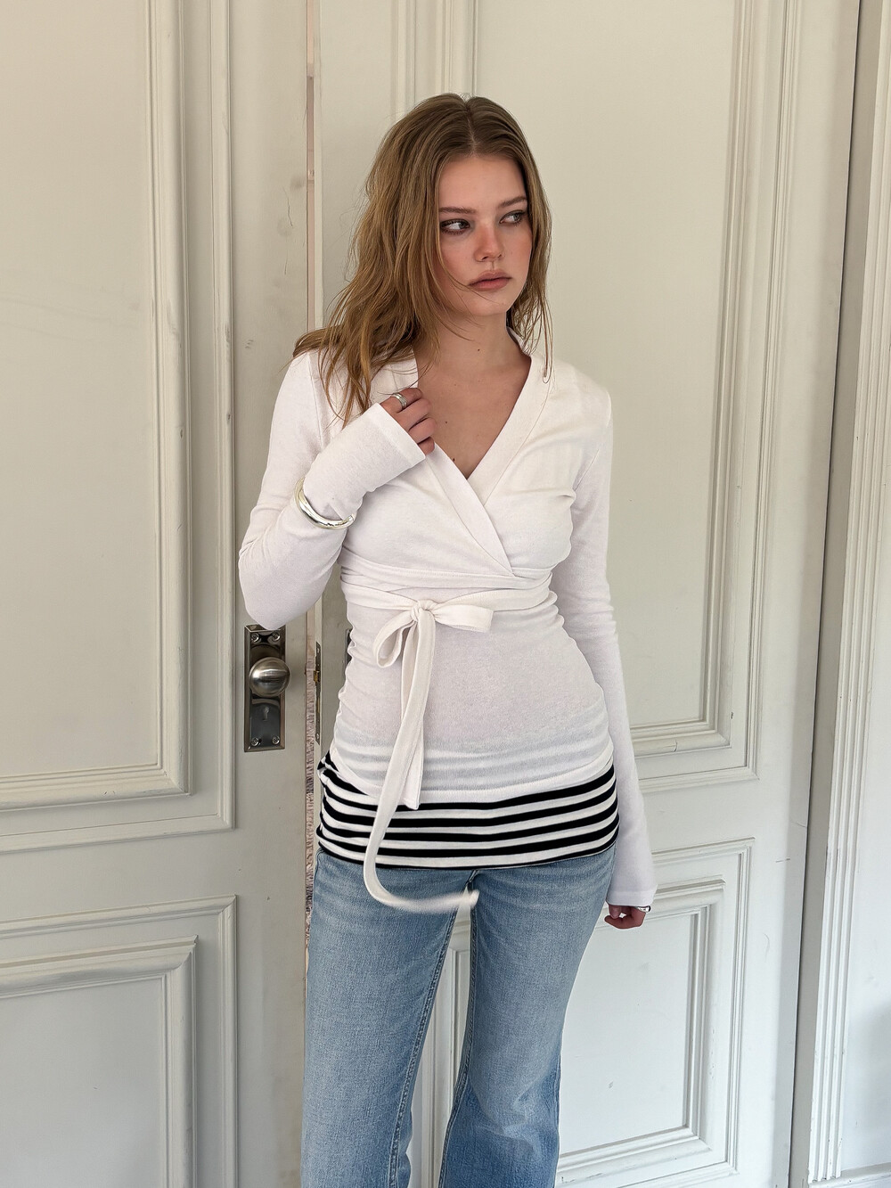 DESCRIPTION - 슬림핏 실루엣 - 랩 가디건과 슬리브리스 셋업 - 허리 라인을 강조하는 랩 디자인과 리본 스트랩 디테일 - 단독 또는 레이어드로 활용 가능한 슬리브리스 탑